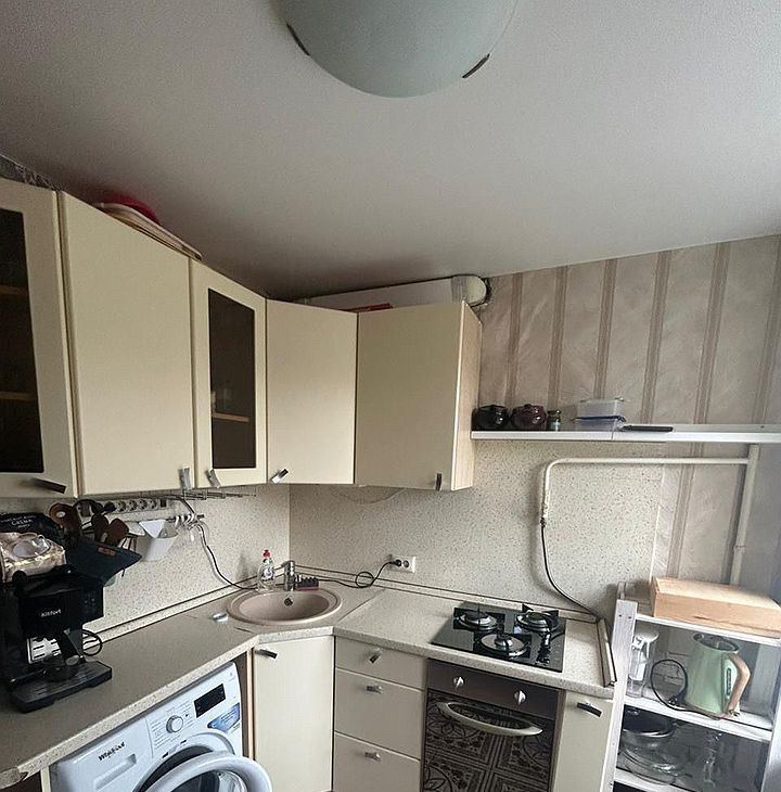 Балкон не остеклен, вся имеющаяся бытовая техника видна на фото (кондиционер, холодильник, газовая плита, стиральная машина, кофемашина, телевизор).