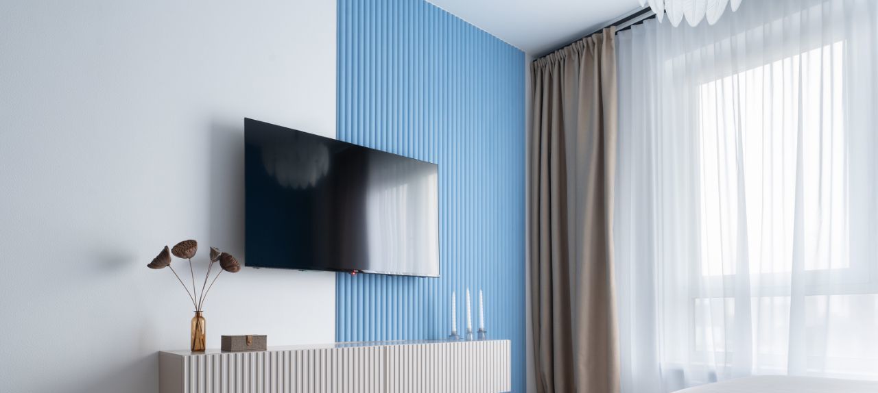 У панорамного окна расположена зона отдыха с раскладным диваном и телевизором.