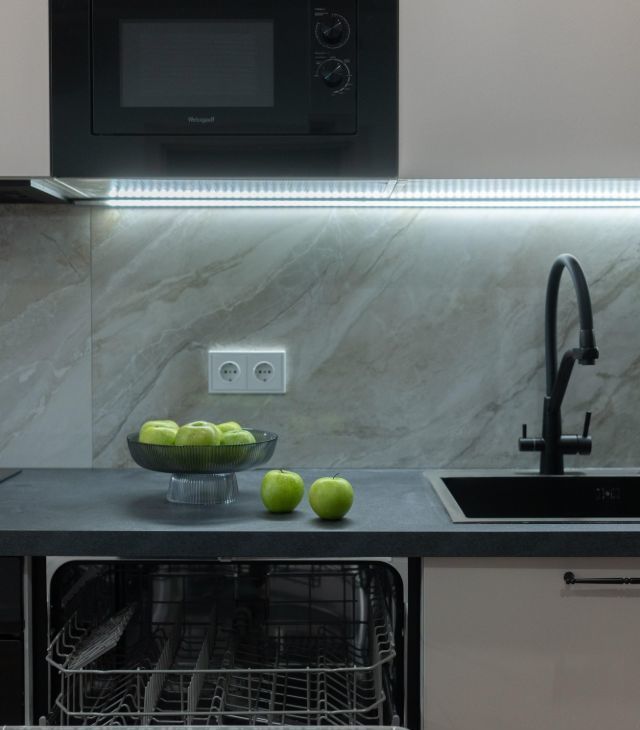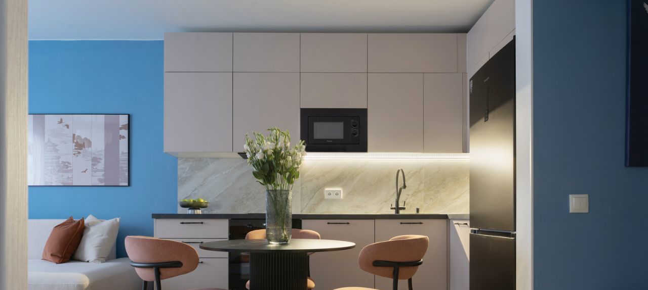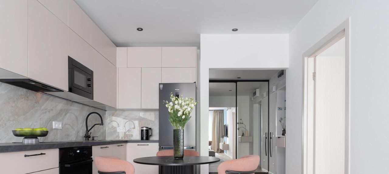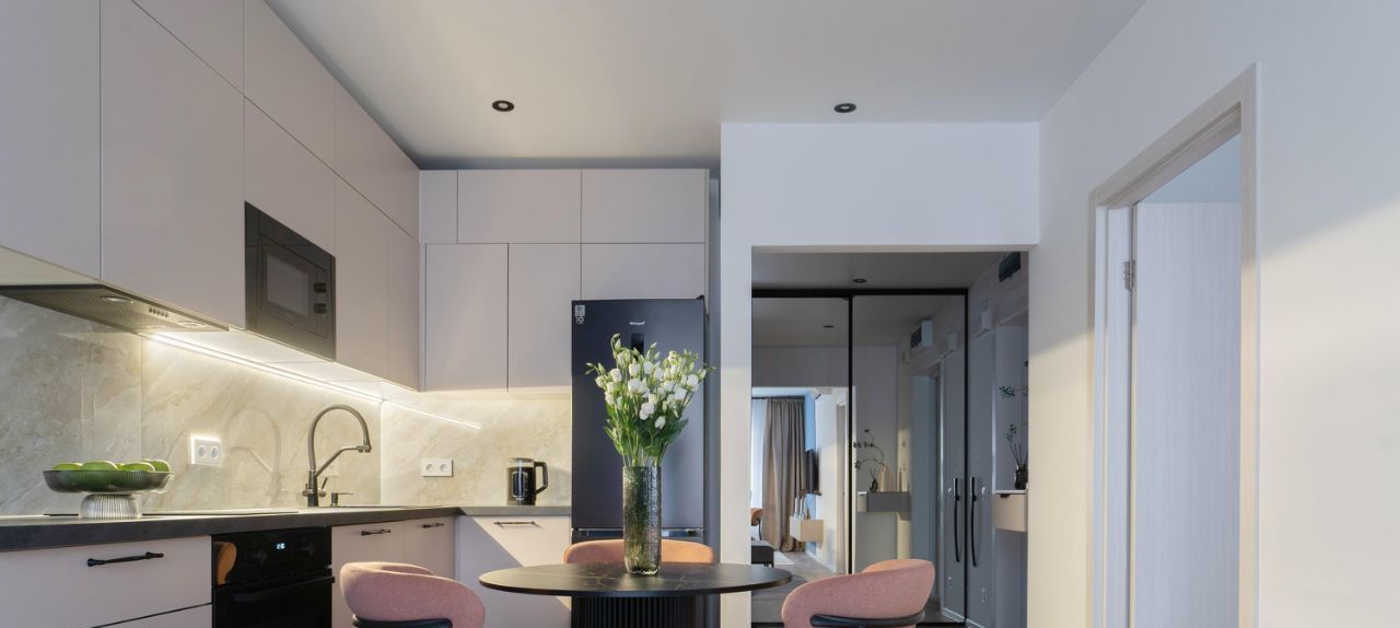 В зоне кухни полный комплект высококачественной встроенной техники, включая холодильник с морозильной камерой, посудомоечную машину, микроволновую печь, индукционную варочную поверхность, духовой шкаф и вытяжку. Предусмотрены удобные места для хранения посуды и продуктов, а также элегантная обеденная зона с отдельным освещением.