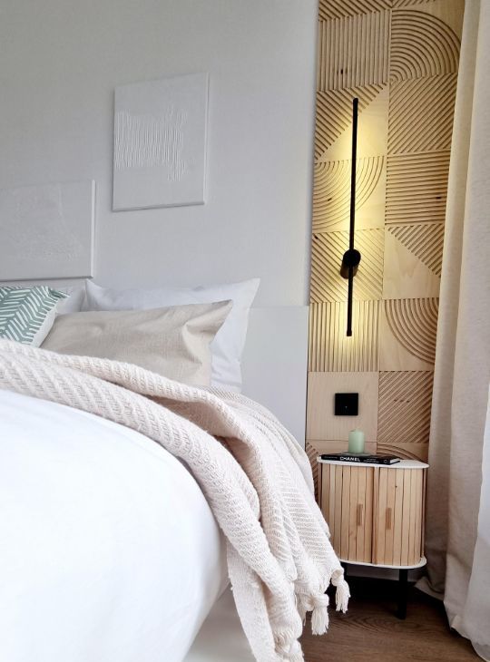 Мебель и декор выполнены на заказ из натуральных материалов древесных пород, что создаёт особую атмосферу в просторной квартире.