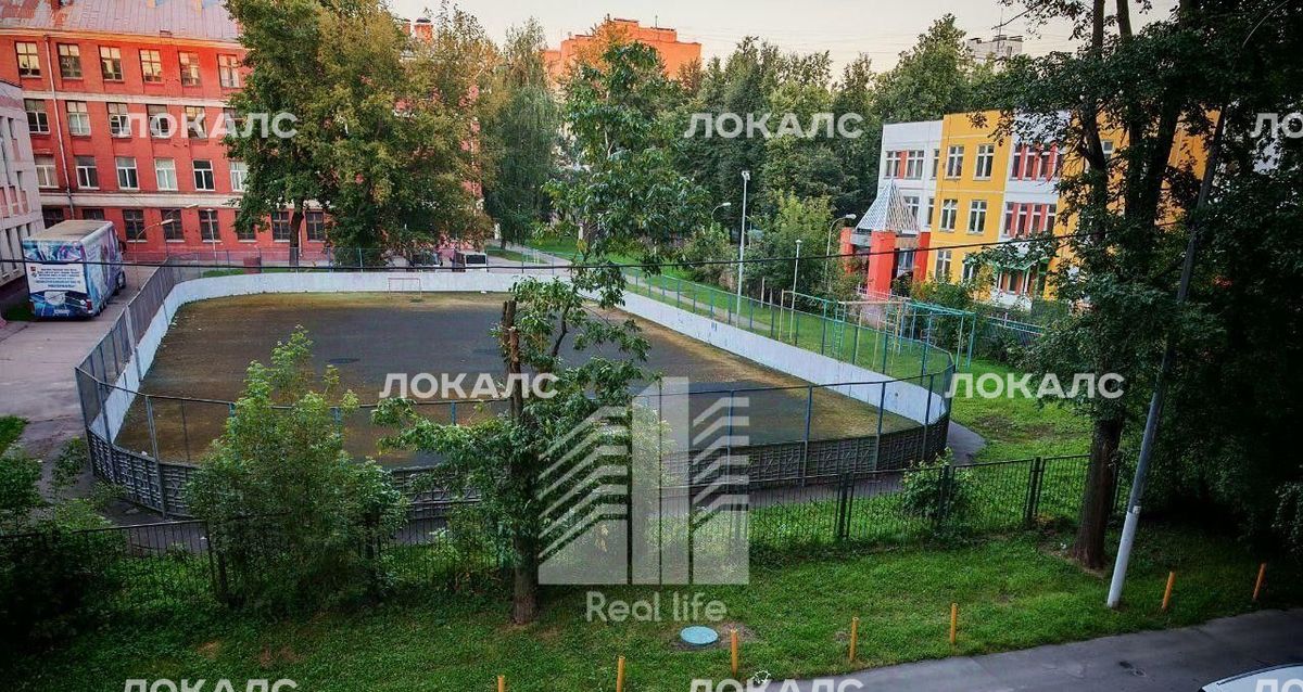 Детская площадка, школа во дворе.