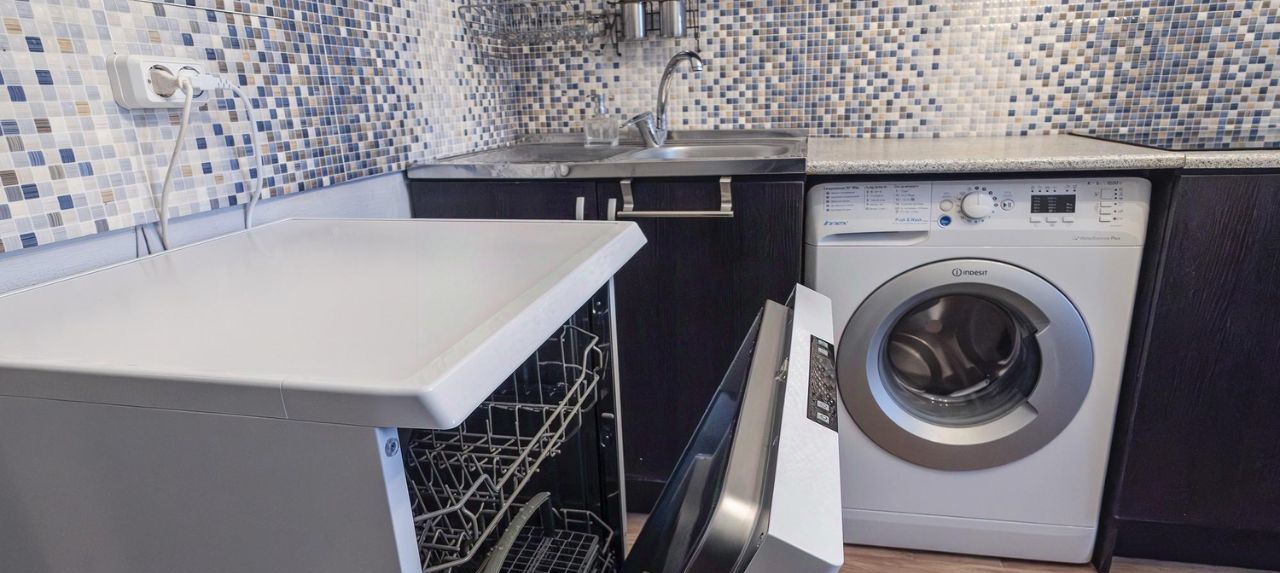 Большая оснащенная кухня. Есть холодильник, электро-плита, духовой шкаф, посудомоечная машина, стиральная машина и микроволновая печь.