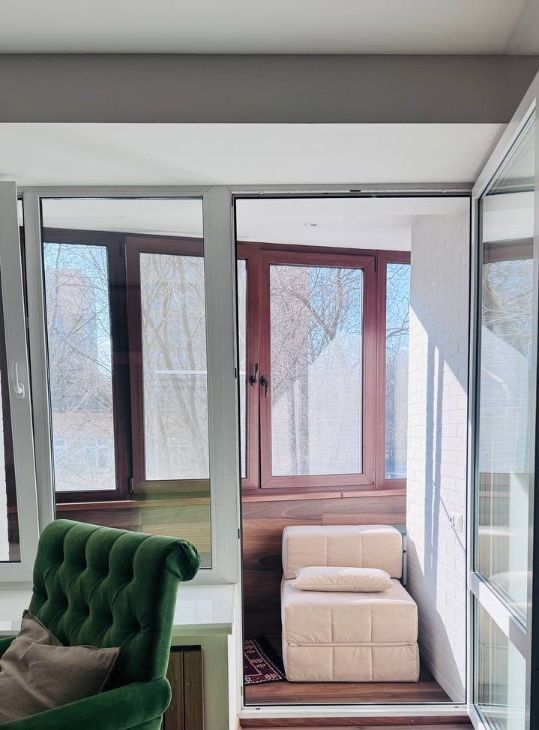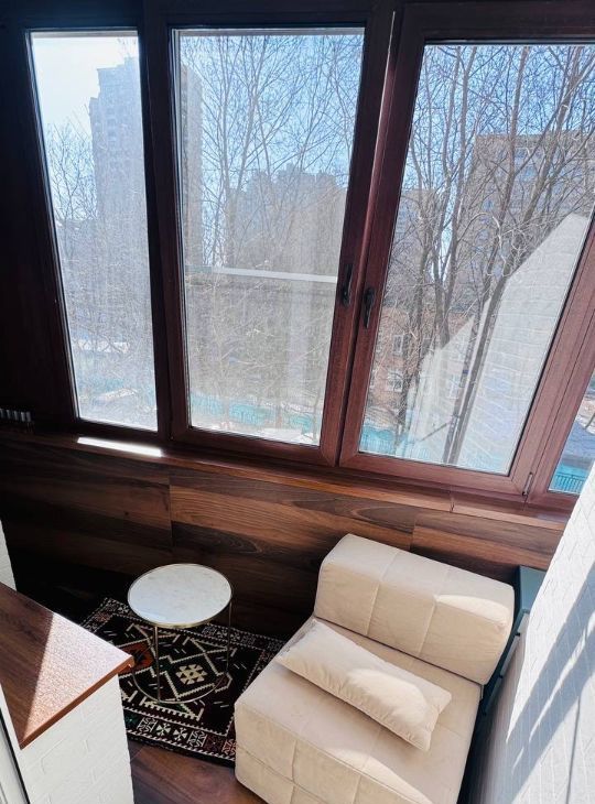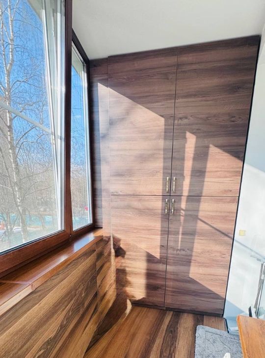 - на балконе встроенные регулируемые батареи, пуфик и ковер, стеллаж для хранения