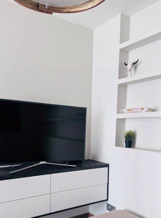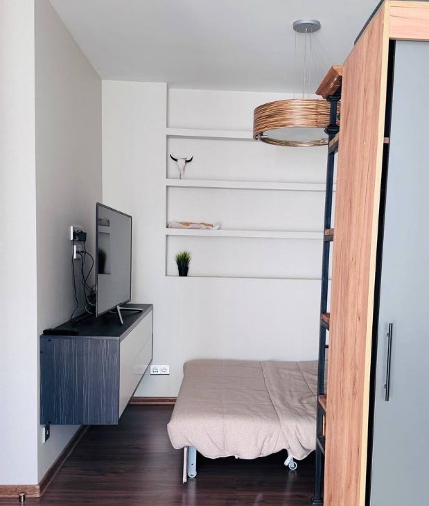 - отдельная зона для спальни: в ней телевизор, прикроватный стеллажик, рамки для картин, встроенные полочки для книг