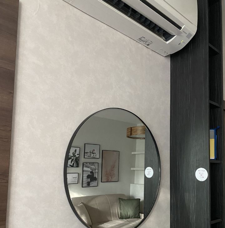 - сверху кондиционер, справа встроенный стеллаж для аксессуаров
