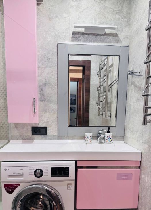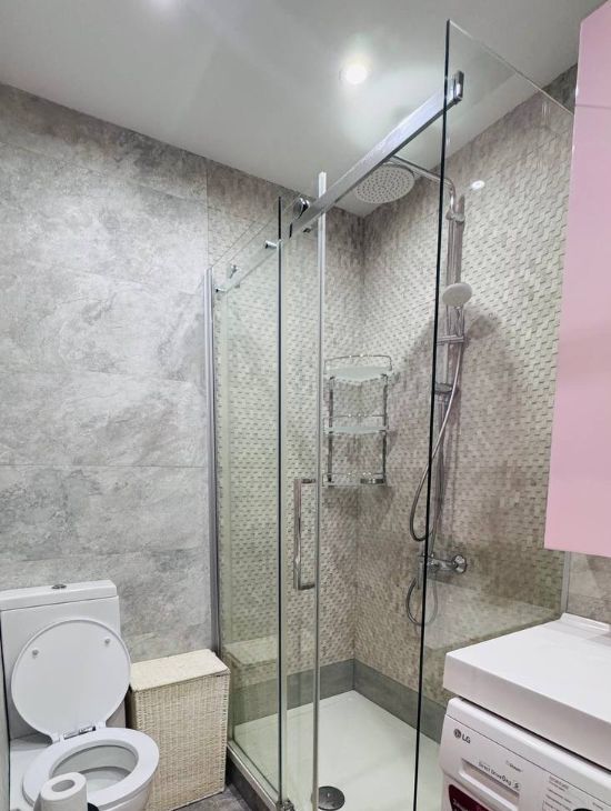 - санузел сдельный: есть корзина для белья, коврик, силиконый ершик, держатель для туалетной бумаги, стеллаж в душевой для средств + отдельный свет над зеркалом