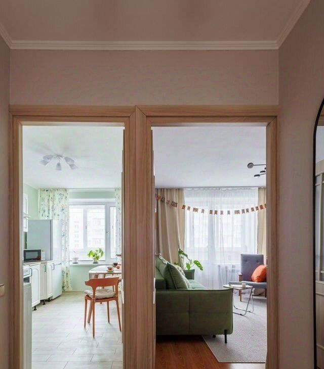 В квартире выполнен хороший ремонт, есть всё для комфортной жизни. Удобная планировка: изолированная комната, много мест для хранения вещей. Чистый подъезд, качественная входная дверь, ухоженная придомовая территория.