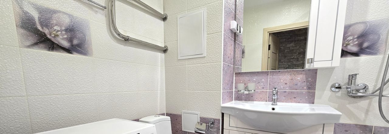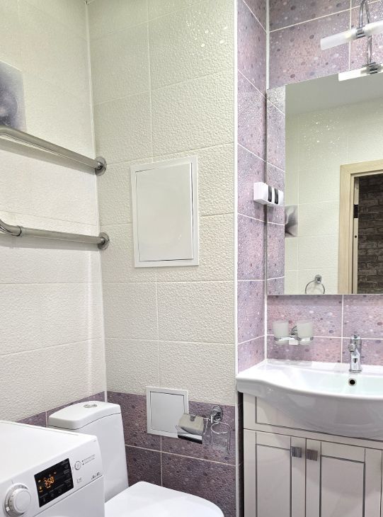 •совмещенный санузел с ванной, унитазом, тумбой с раковиной с мебельным гарнитуром и стиральной машиной.