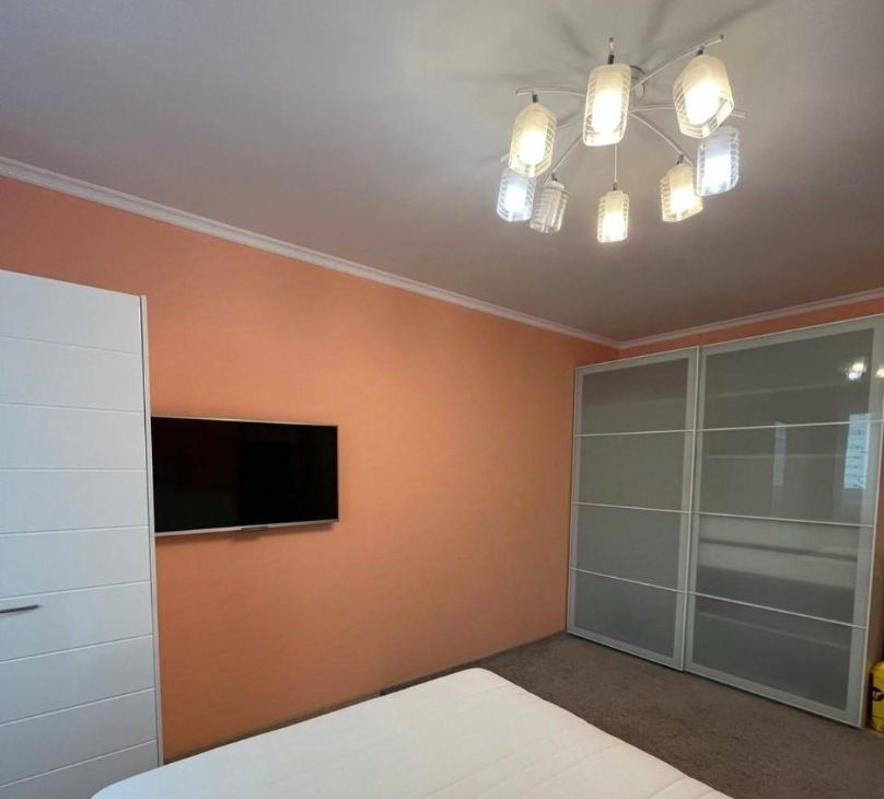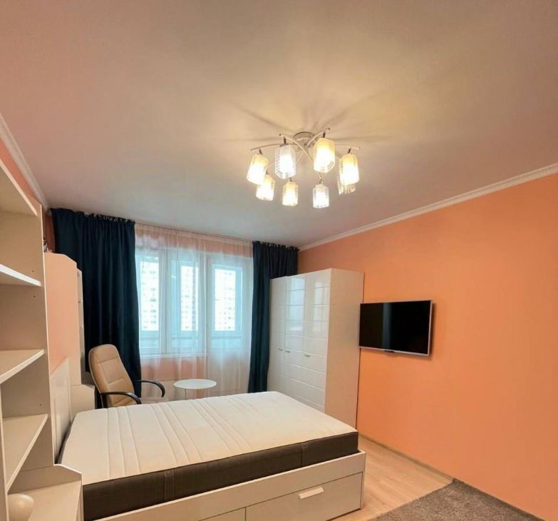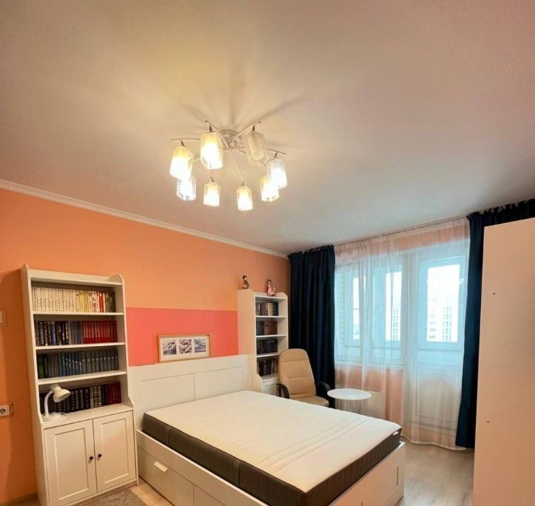 Шкафы для хранения большого количества вещей, прикроватная секция, 1 распашной шкаф в прихожей для верхней одежды, на кухне также много места для хранения посуды и кухонной утвари (кухонный гарнитур+шкаф-витрина). Если понадобится - могу предоставить детскую кровать с матрасом 160*80 и заменить шторы на бежевые.