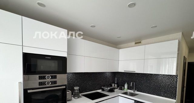 В кухонной зоне установлен дорогостоящий немецкий кухонный гарнитур изготовленный на заказ с каменной столешницей, с встроенной посудомоечной машиной, микроволновой печью и духовым шкафом.