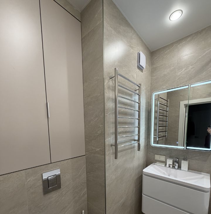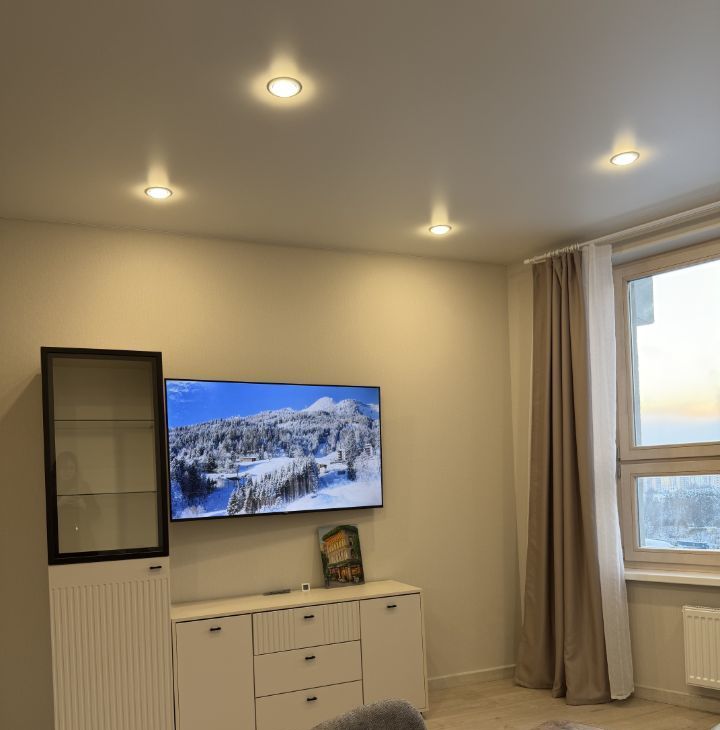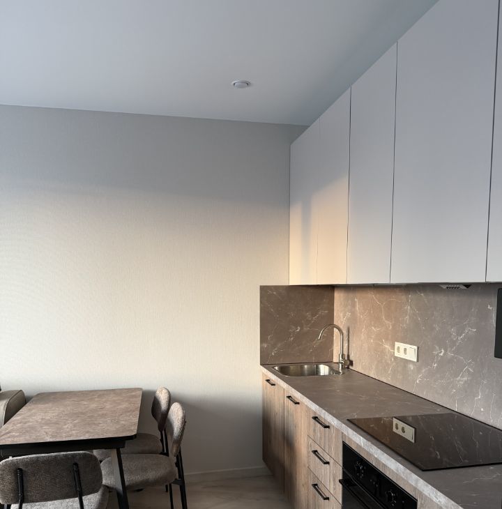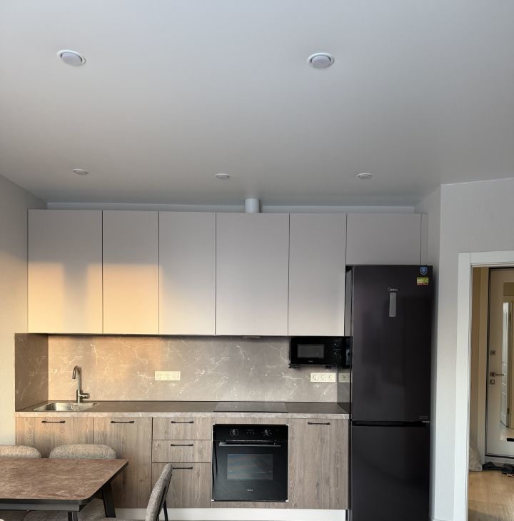 В кухне современная бытовая техника, включая холодильник, индукционную плиту, духовку, посудомоечную машину, микроволновую печь, вытяжку. Также позднее будет установлен кондиционер. В зоне гостиной установлен смарт ТВ 55 дюймов с Алисой. В квартире есть Wi-Fi.