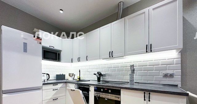 Квартира оборудована кухонным гарнитуром, мебелью и бытовой техникой: