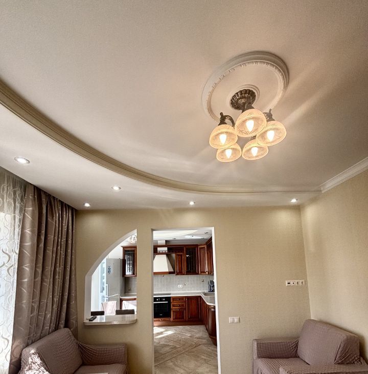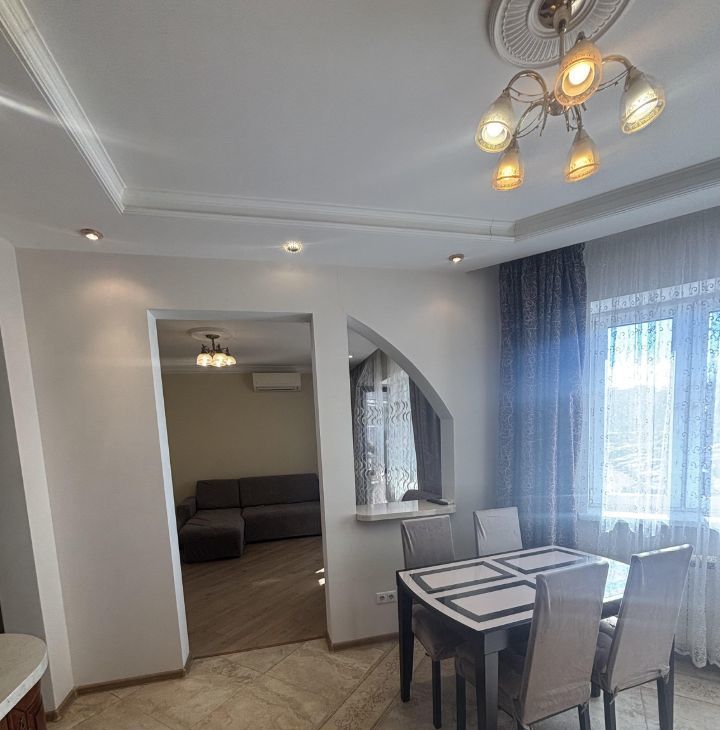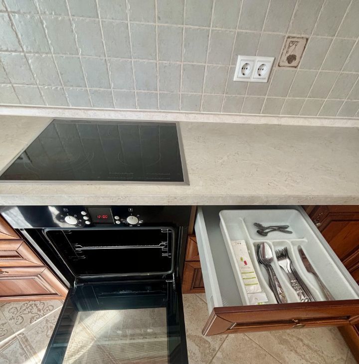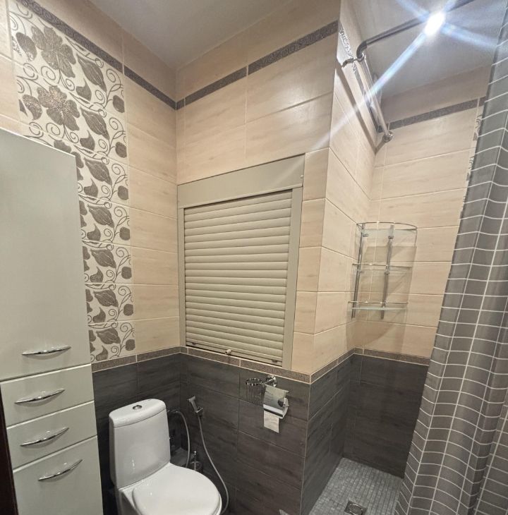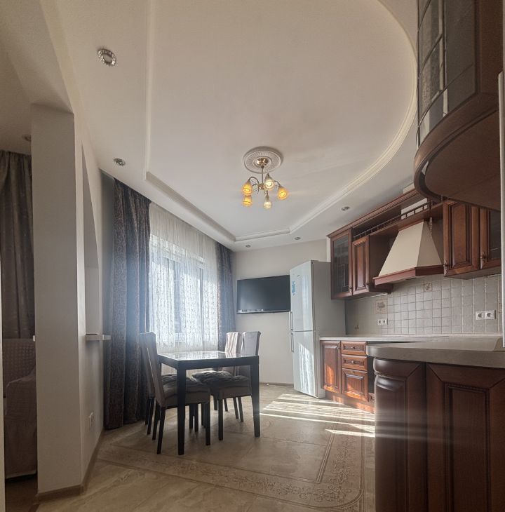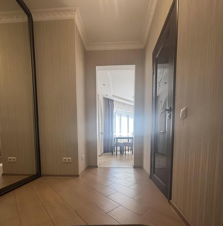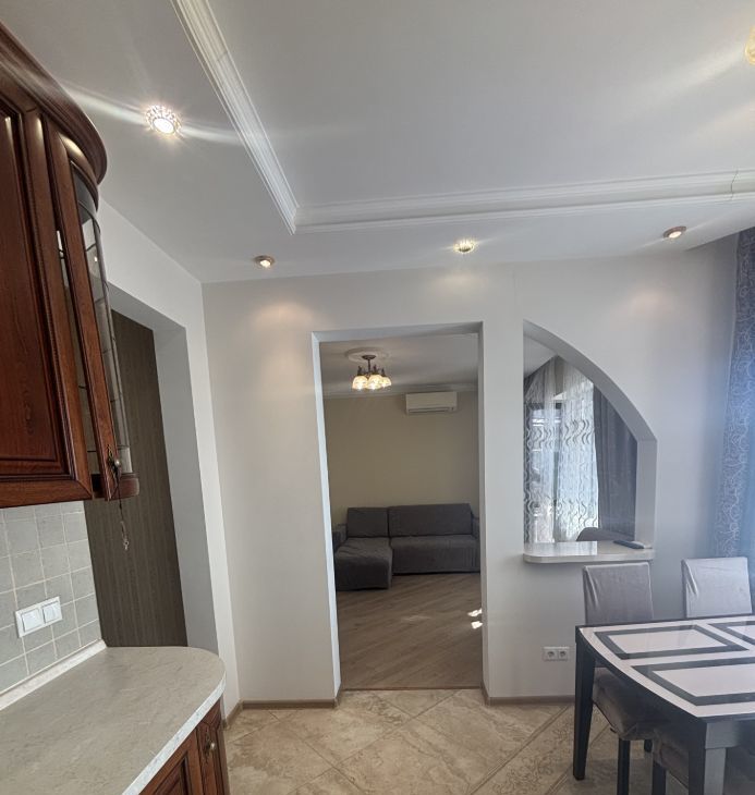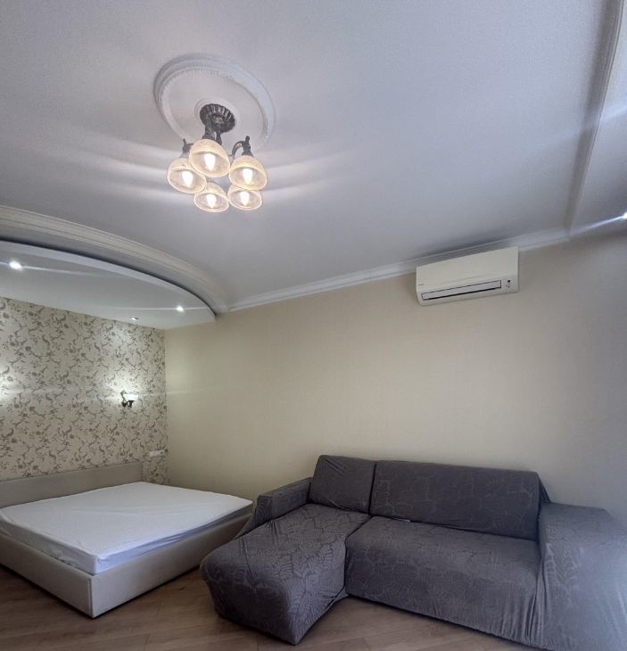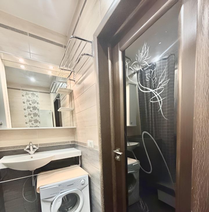 Квартира с дизайнерским ремонтом, полностью меблирована и готова к заселению. На кухне есть вся необходимая мебель и техника, включая холодильник, посудомоечную машину и кондиционер. В комнате — удобная мебель и телевизор. Ванная комната оборудована душевой кабиной и стиральной машиной. Также в квартире проведён интернет.