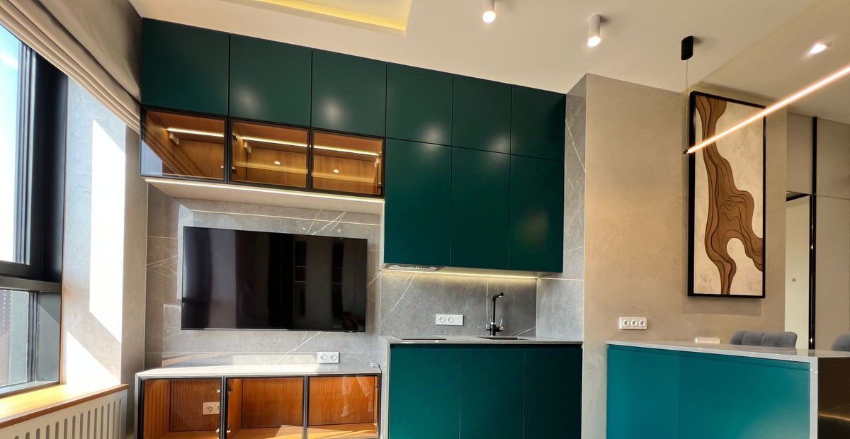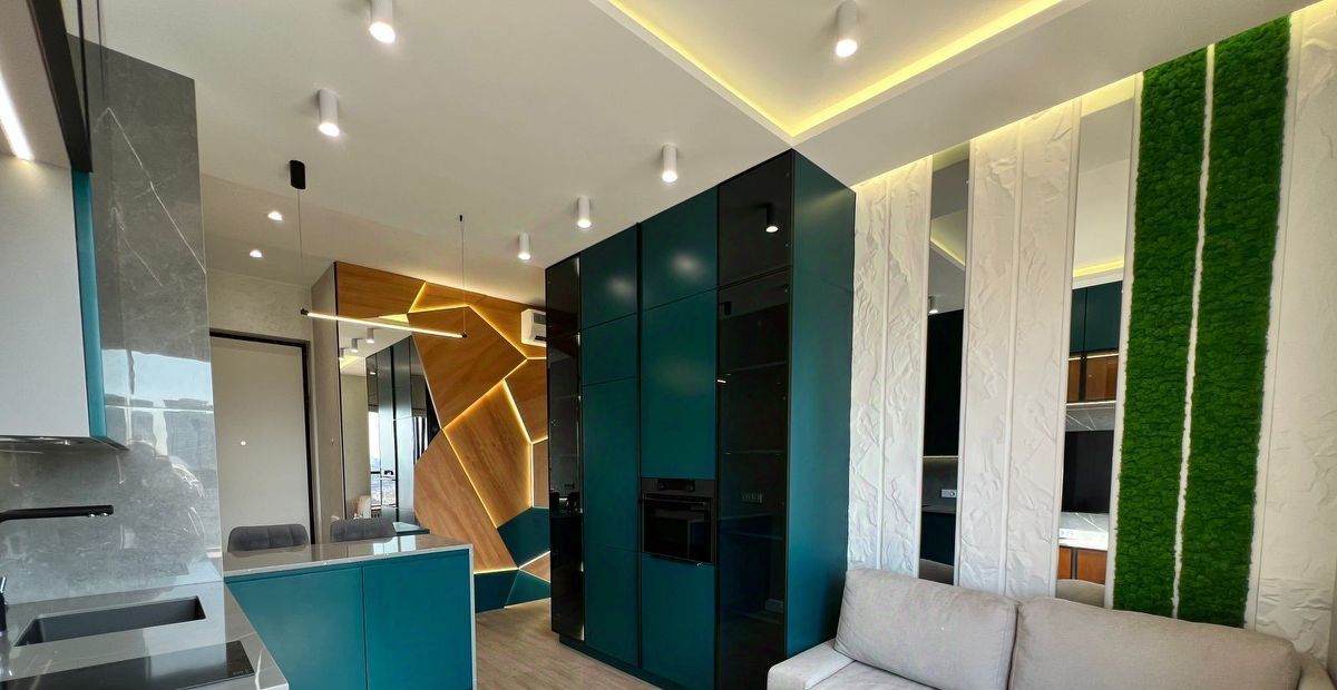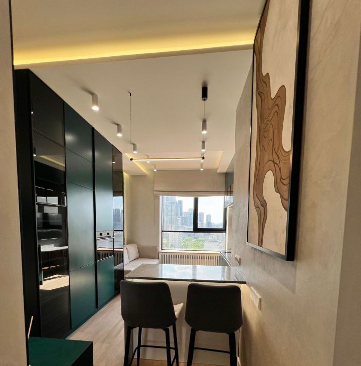 Есть все необходимое для комфортного проживания: современная мебель, как в комнате, так и на кухне, полный комплект техники, включая кондиционер, холодильник, п/м машина, телевизор (в зоне гостиной и спальни), стиральная машина (с сушкой).