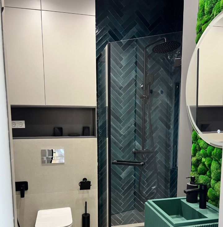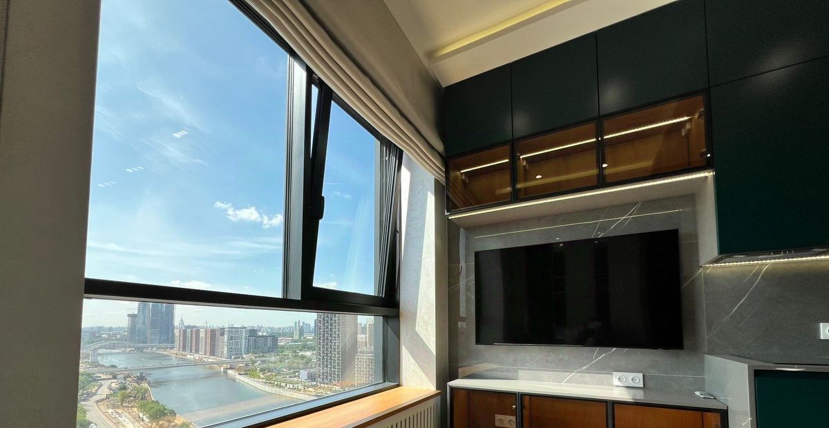 Просторный совмещенный санузел оборудован душевой кабиной. Панорамные окна выходят на реку и Москва - Сити. Высокий этаж открывает красивые видовые характеристики!