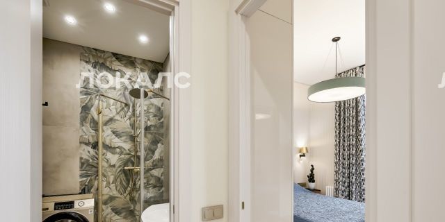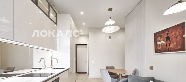 Квартира оборудована встроенной бытовой техникой: варочная панель, вытяжка, духовой шкаф, микроволновая печь, холодильник, стиральная и сушильная машины, телевизор. Установлен кондиционер.