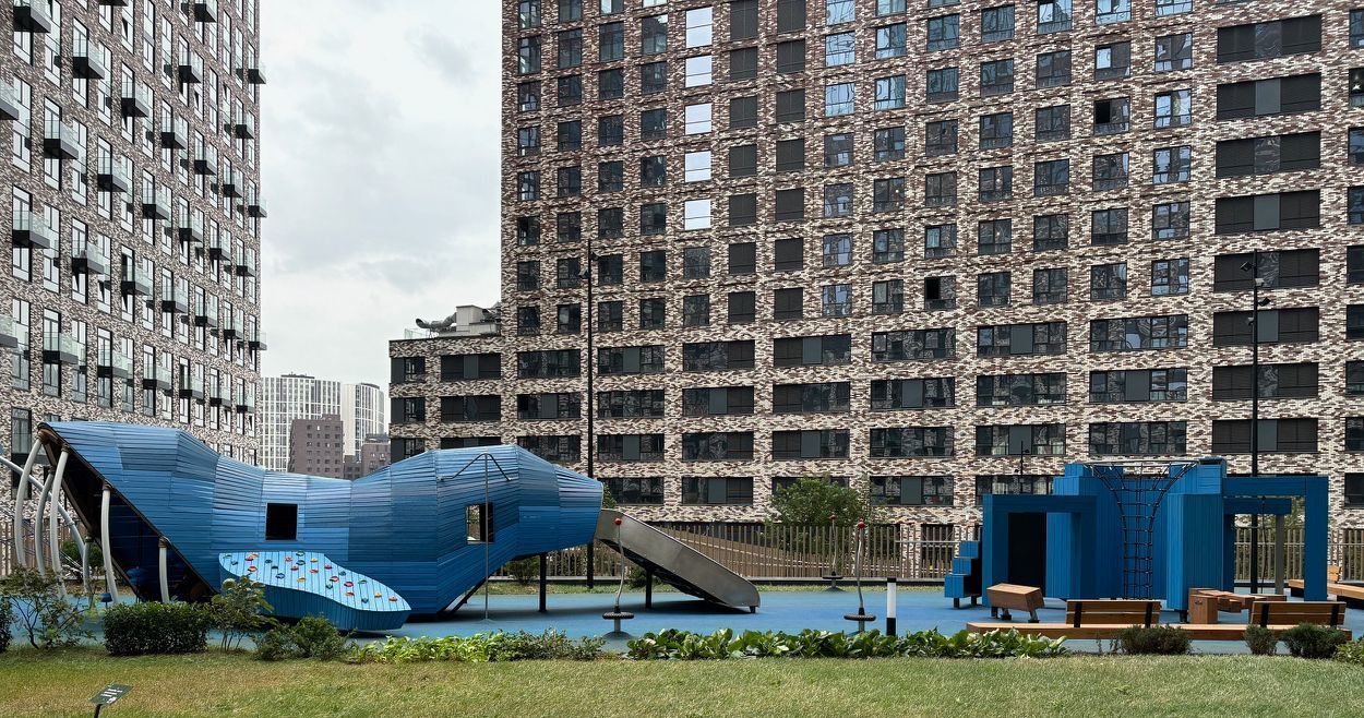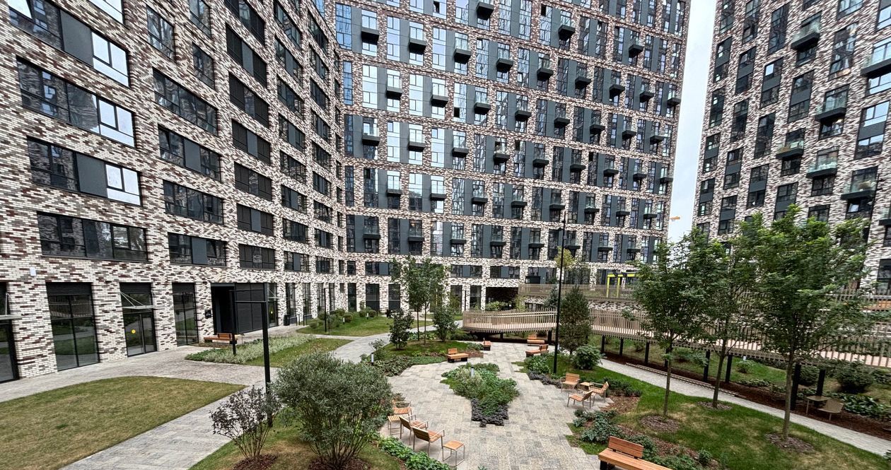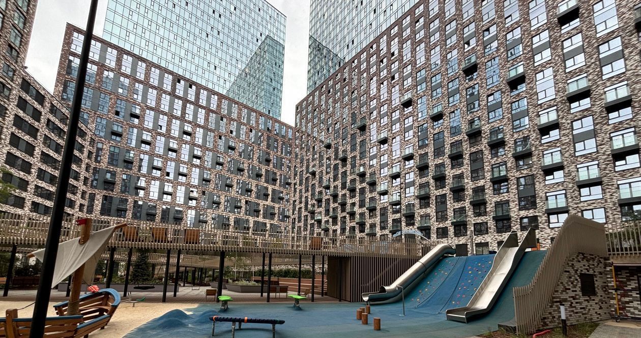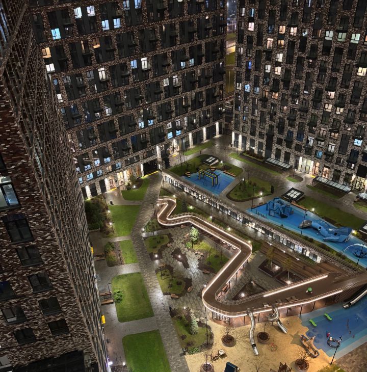 В комплексе торговый центр с магазинами, кафе, пунктами доставки и фитнес-центром.