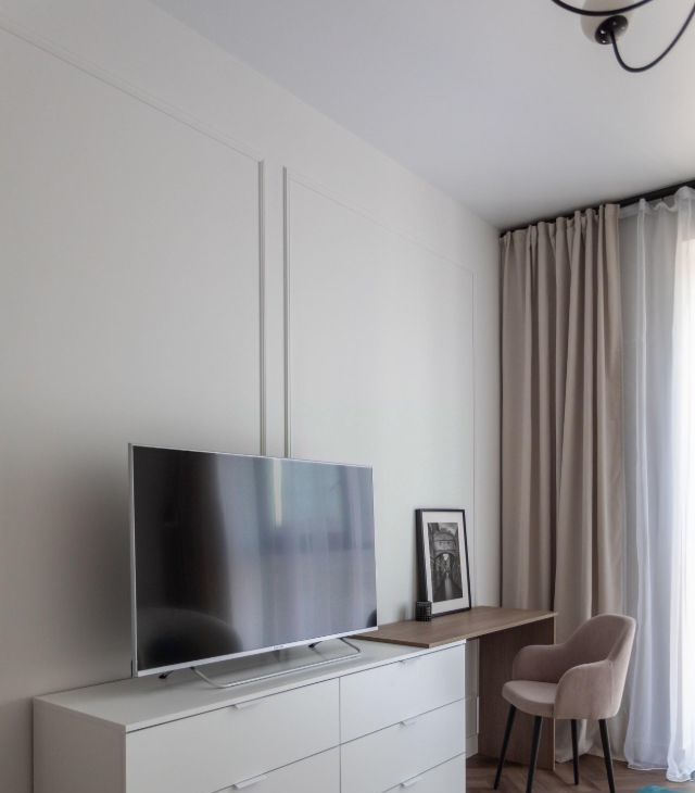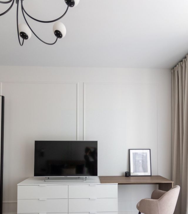 - изолированная спальня: просторная, с большой кроватью, телевизором и зоной для работы.