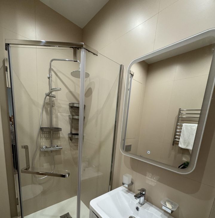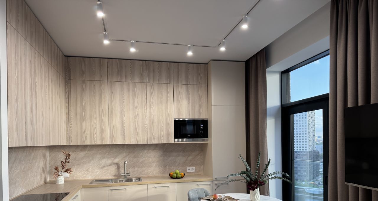 Квартира оснащена всем необходимым для комфортного проживания: встроенная техника - холодильник с морозильной камерой, духовой шкаф, варочная плита, микроволновая печь, посудомоечная машина с лучом индикации, стиральная машина с функцией сушки, системой воздушного кондиционирования и обогрева, смарт-ТВ 50 дюймов и Wi-Fi.