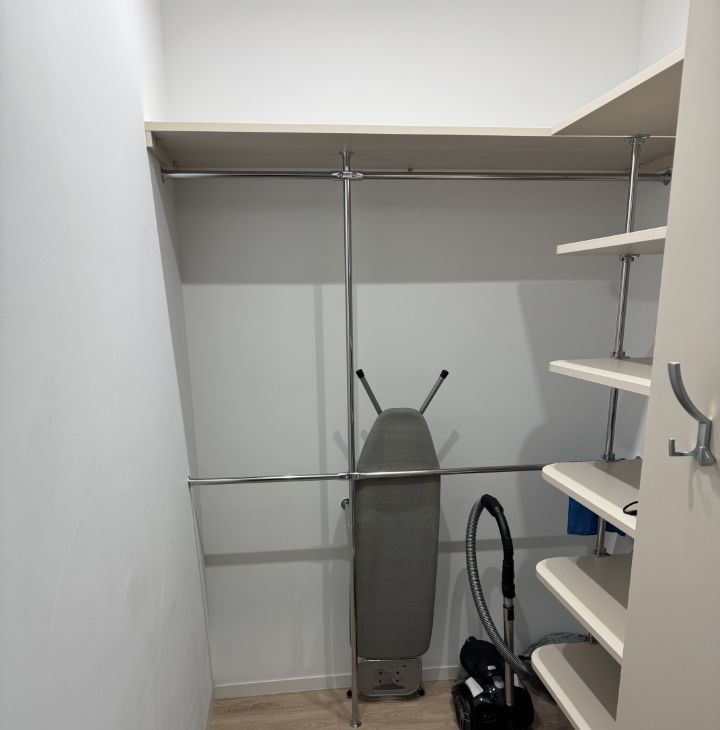 В просторной гардеробной имеется пылесос, гладильная доска с утюгом и стремянка.