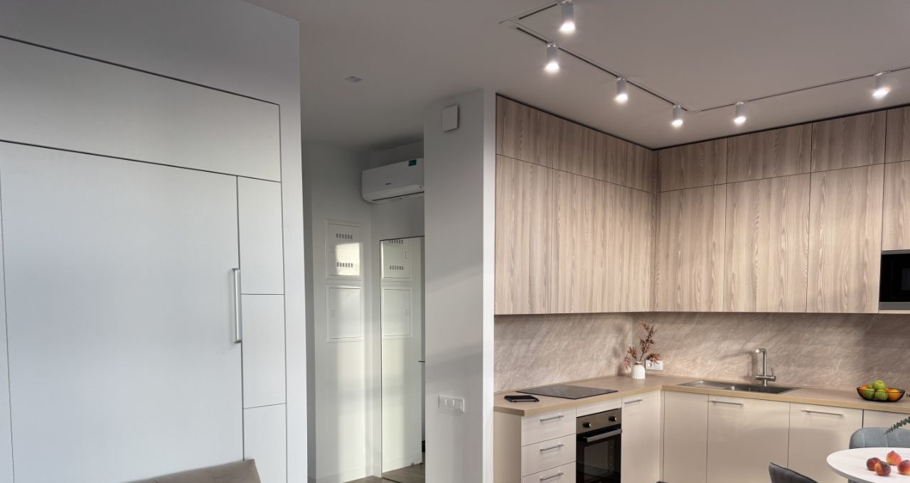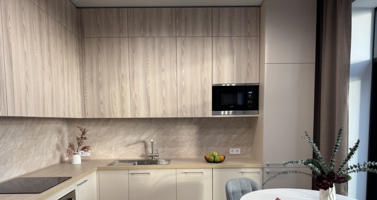 Квартира отличается современным дизайнерским ремонтом, который выполнен в теплых пастельных тонах с учетом современных стандартов. Квартира оборудована встроенной мебелью, изготовленной по индивидуальному проекту. Функциональный механизм дивана-кровати позволяет использовать максимальное жизненное пространство в моменты активности и предлагает комфорт привычной спальной кровати во время отдыха.