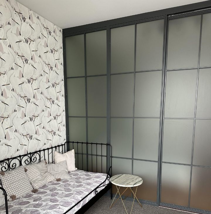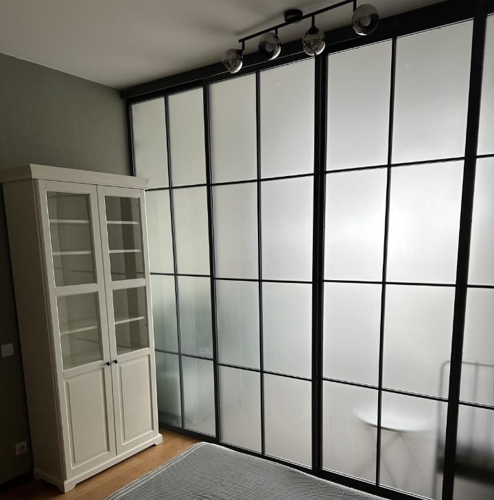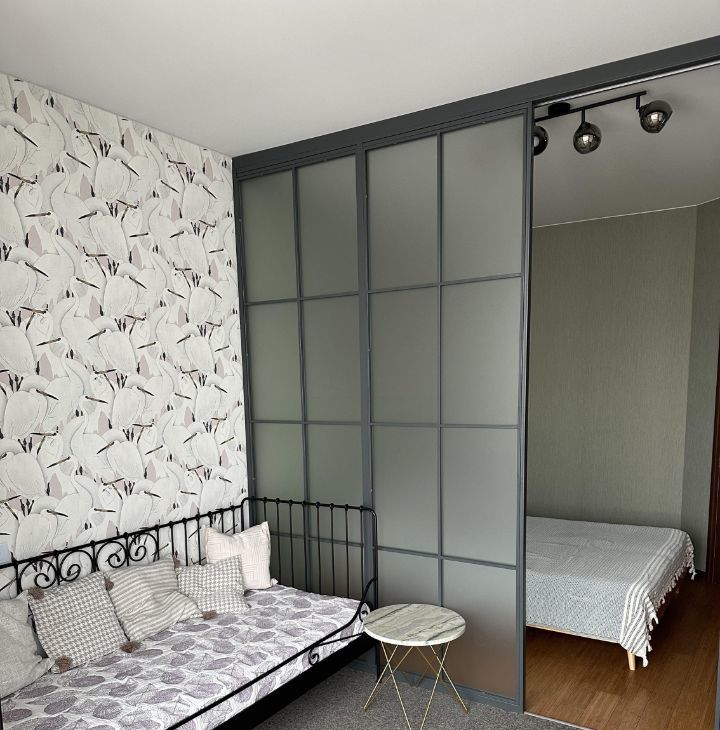 - Комната разграничена раздвижной дверью на спальную зону и место для отдыха.