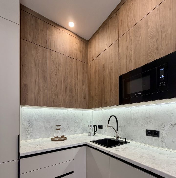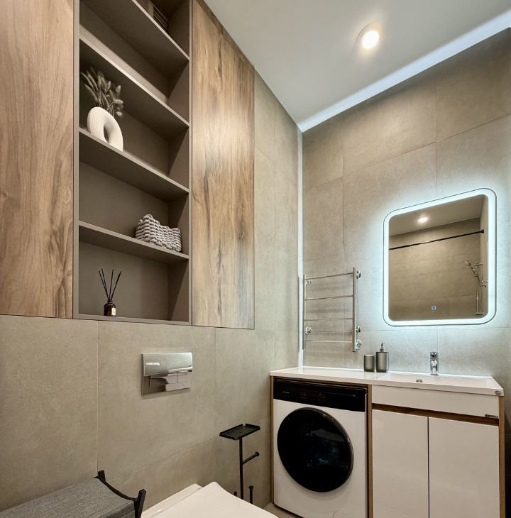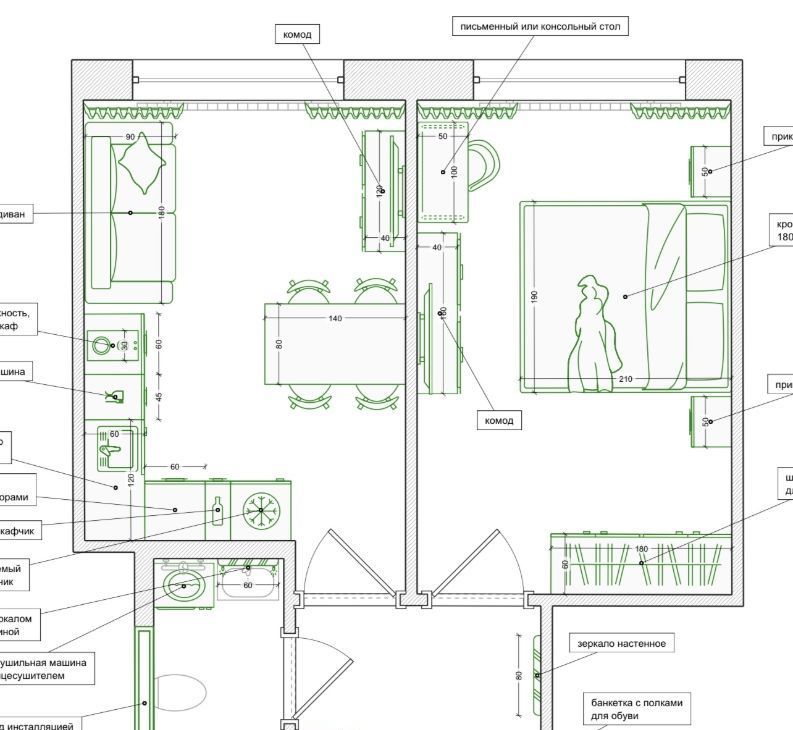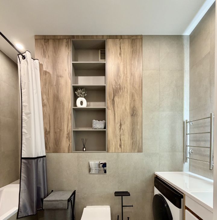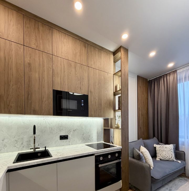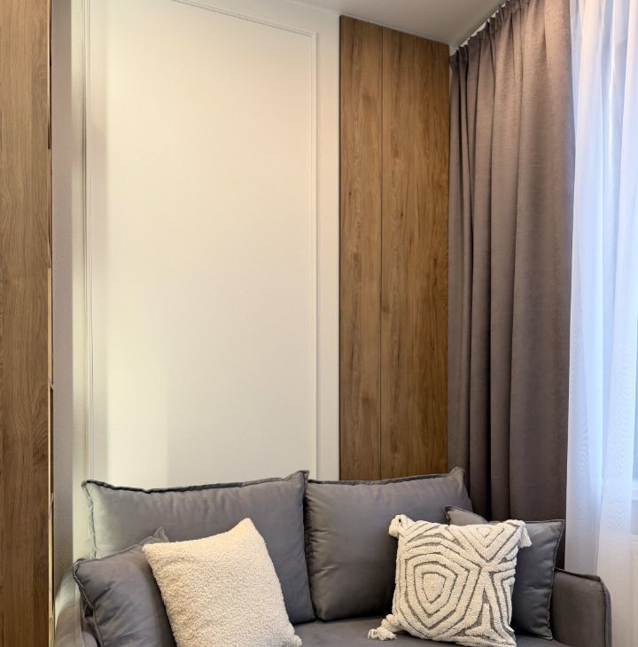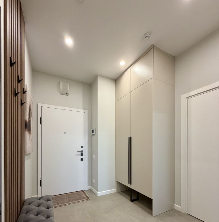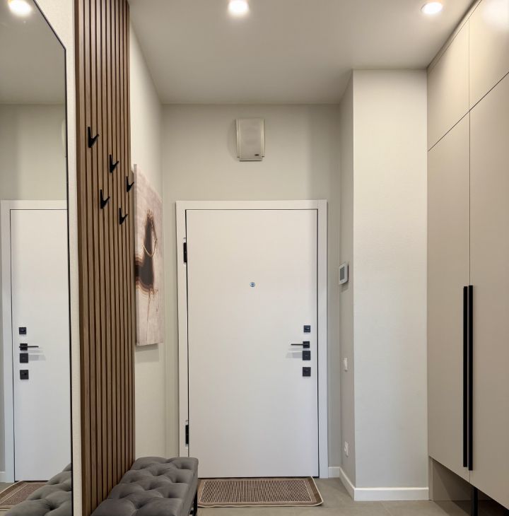 Для Вас создано большое количество мест хранения: 2 шкафа в спальне и прихожей, кухня в потолок, изготовленные по индивидуальному заказу, кровать с матрасом от Askona 180*200 см с подъемным механизмом и местом для хранения под кроватью, раскладной диван-кровать.