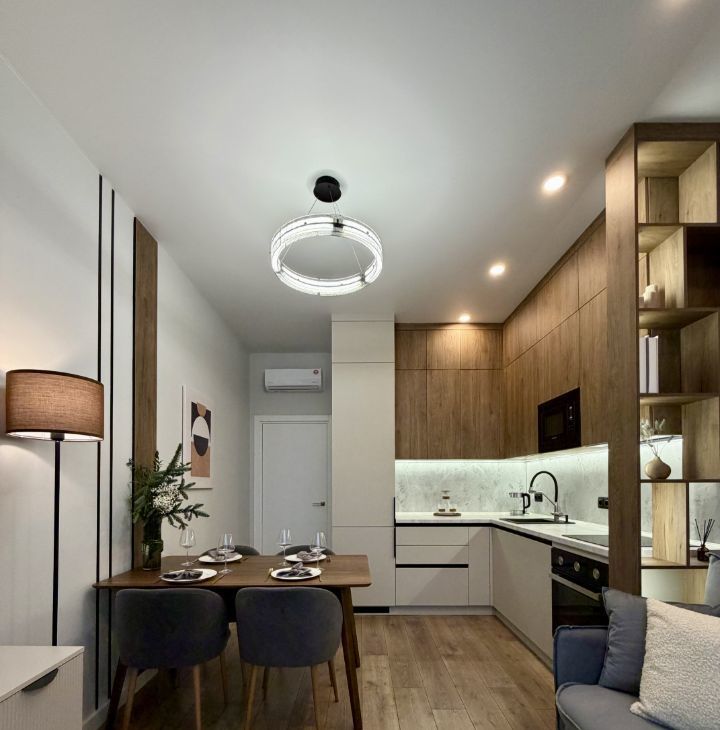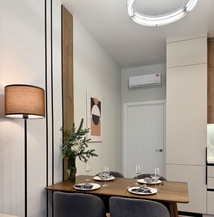 Квартира укомплектована новой качественной мебелью, а также всей необходимой европейской техникой: стиральная машина с функцией сушки, посудомоечная машина, встроенный холодильник, микроволновая печь, духовой шкаф, индукционная варочная панель на 3 конфорки, вытяжка, кондиционеры в каждой комнате. В квартире уже есть новый набор посуды, столовые приборы и постельное белье.