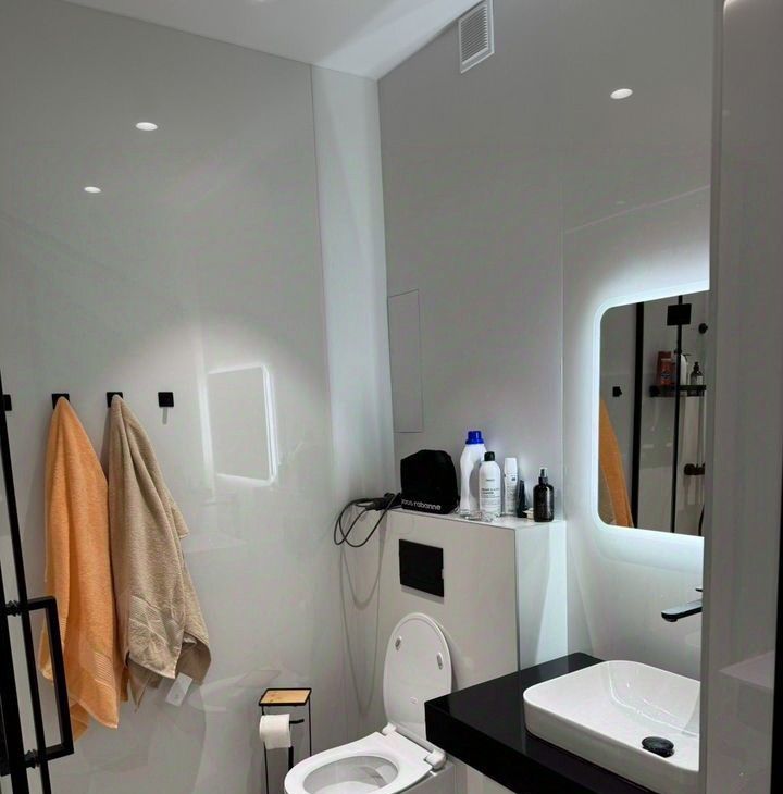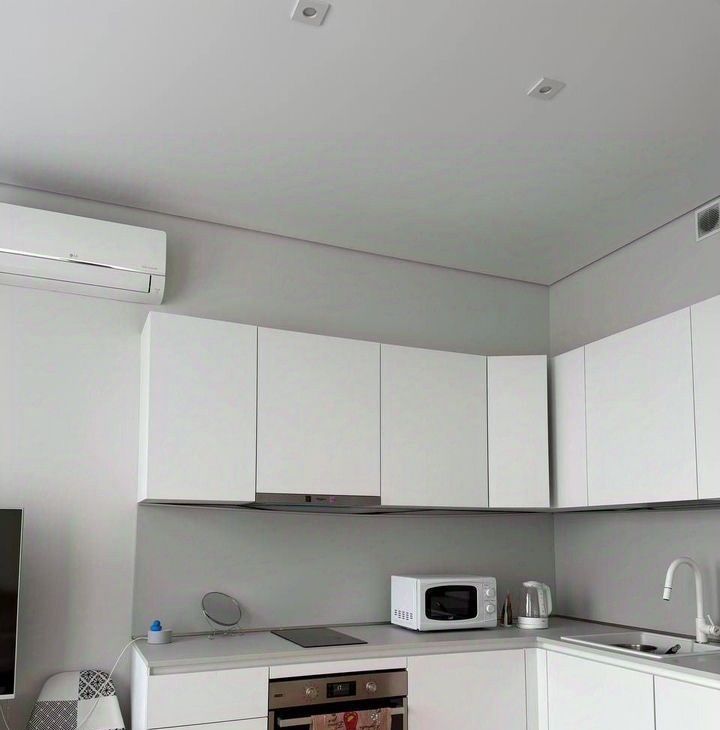 Квартира оборудована кухней с индукционной плитой, духовым шкафом, посудомоечной машиной, встроенным холодильником и встроенной морозильной камерой, вытяжкой, микроволновой печью, электрическим чайником. Имеется телевизор, кухонный/рабочий стол, стулья, посуда для приготовления и приема пищи, столовые приборы.