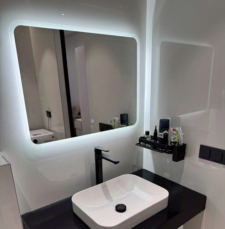 В санузле: отделка керамогранитом, большая душевая кабина, стирально-сушильная машина.