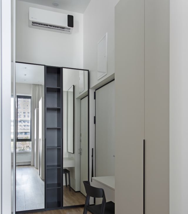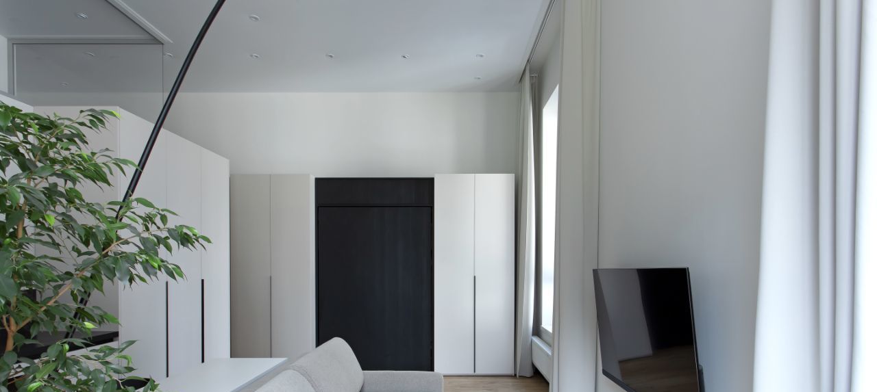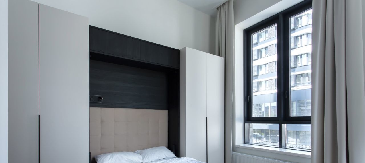Современный дизайн. Качественная мебель с немецкой фурнитурой. Большое количество шкафов (6 шт) для хранения одежды и обуви. Вертикальная откидная кровать с анатомическим матрасом (1,4х2м) с независимыми пружинами легко убирает в шкаф, освобождая место в гостиной.