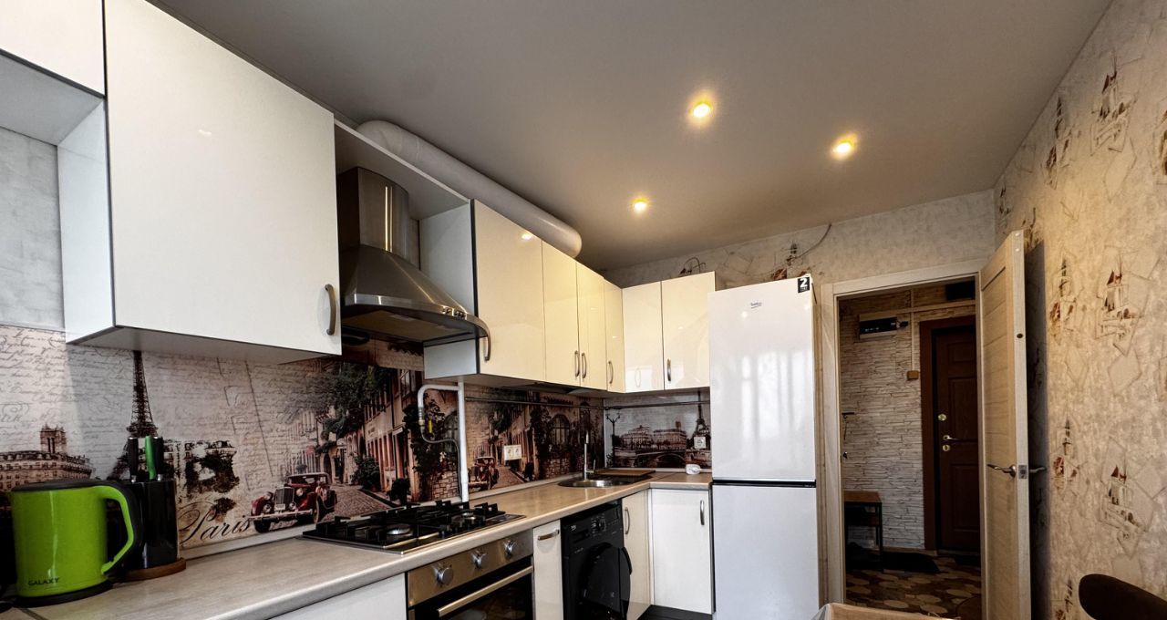 В квартире есть все необходимое для комфортного проживания. На кухне и в комнате - современная мебель, а также техника: холодильник и стиральная машина. Санузел совмещенный, оборудован ванной. Для удобства жильцов в доме предусмотрены два пассажирских лифта и мусоропровод.