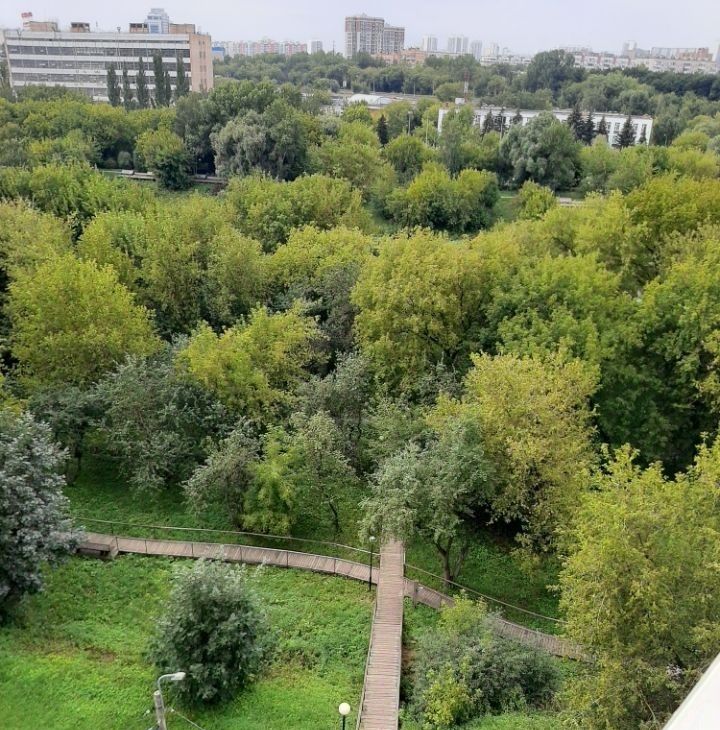 Между домом и рекой парк "Берег реки Сходни" с детскими и спортивными площадками.