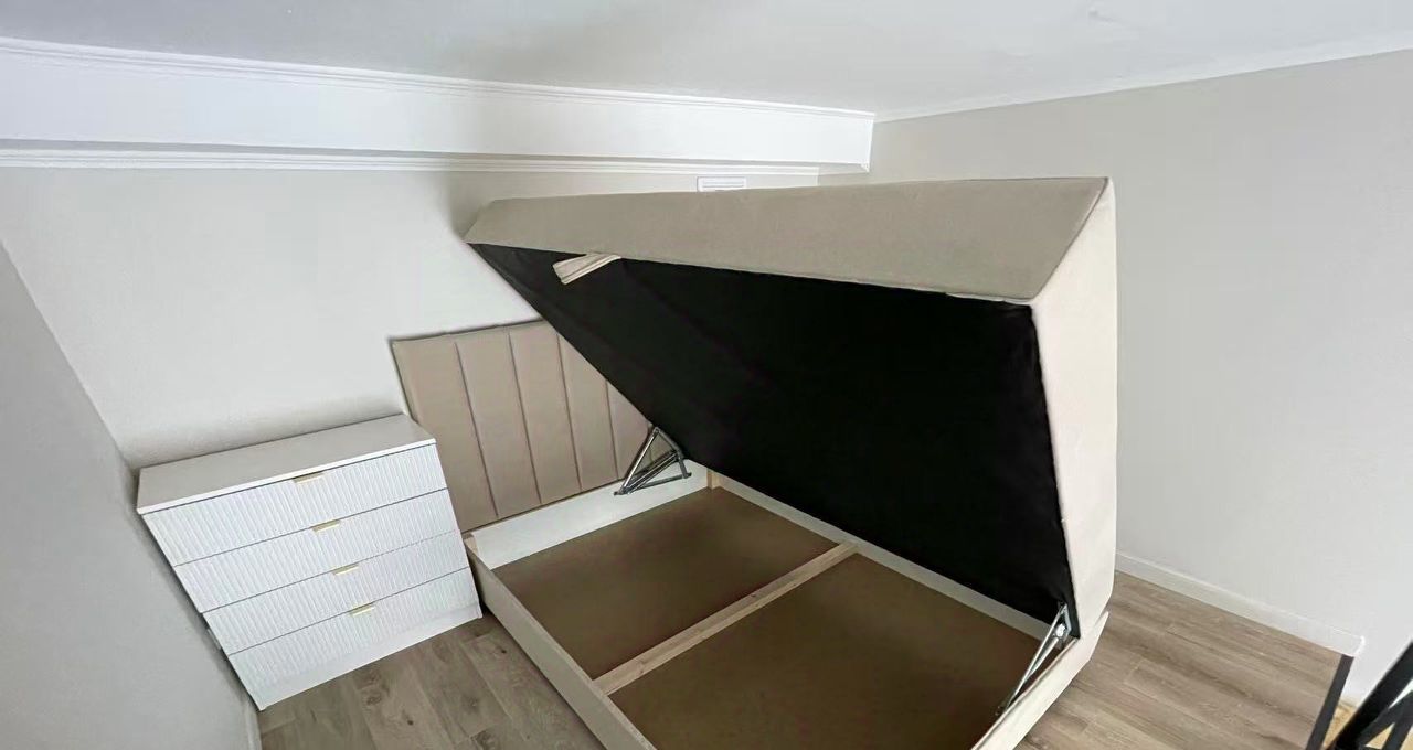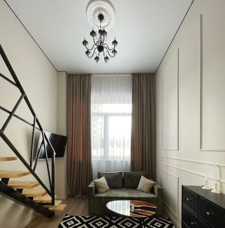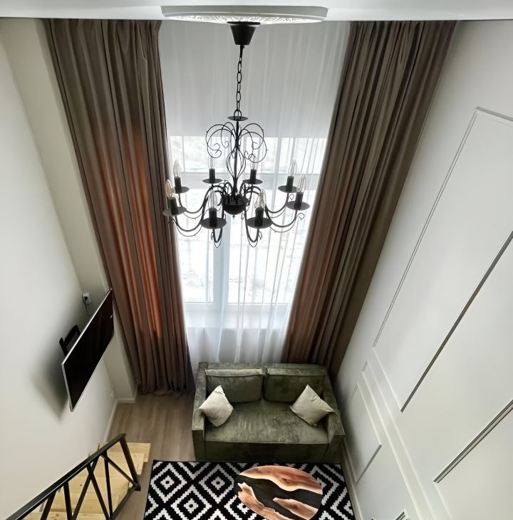 Высота потолков 4м создаёт ощущение простора, а продуманная планировка разделяет пространство на зону отдыха и работы. Внизу — компактная кухня и диванная зона, наверху — комфортная кровать.
