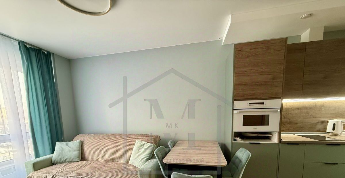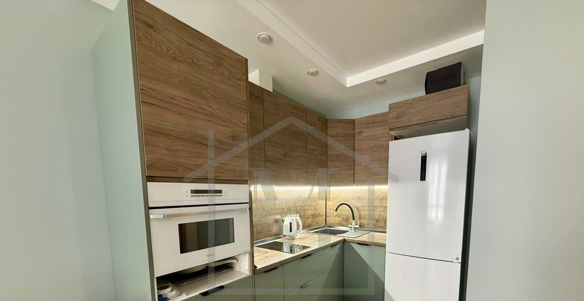Кухня-гостиная оборудована необходимой техникой (холодильник, духовка/свч, варочная панель, вытяжка), в зоне гостиной раскладной диван.