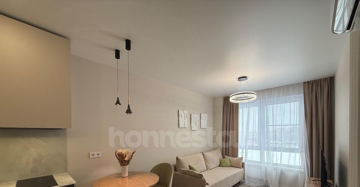 Сдаётся в аренду стильная однокомнатная квартира с дизайнерским ремонтом в новом монолитном доме 2024 года постройки. Общая площадь составляет 33 кв. м, из которых 10 кв. м занимает жилая зона и просторная кухня площадью 16 кв. м. Квартира расположена на 15 этаже 33-этажного дома, что позволяет наслаждаться прекрасным видом на улицу из окон.