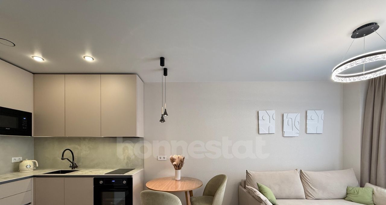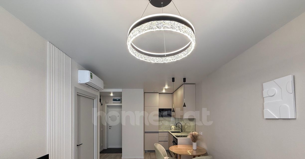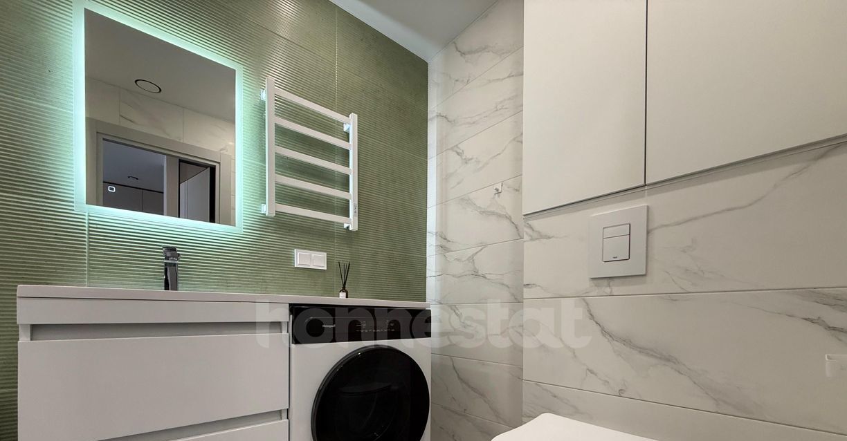 В квартире выполнен дизайнерский ремонт, который создаёт атмосферу уюта и комфорта. Просторная кухня оборудована всей необходимой мебелью и современной техникой: посудомоечной машиной, холодильником и кондиционером. Имеется вся посуда. Заезжай и живи. В комнате также есть мебель, а в ванной комнате установлена ванна. Для вашего удобства в квартире имеется телевизор и стиральная машина, а также подключён интернет.