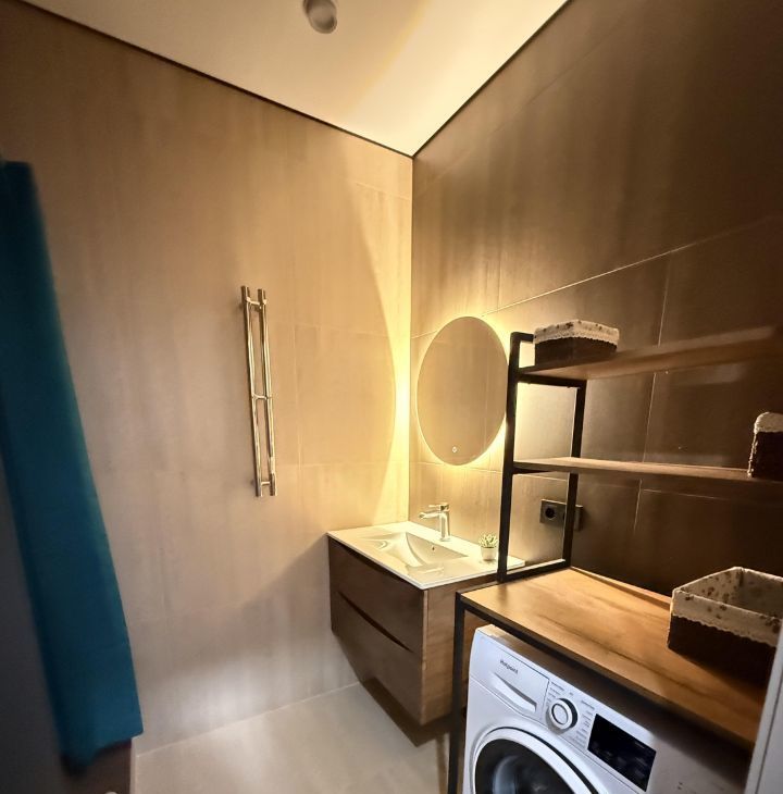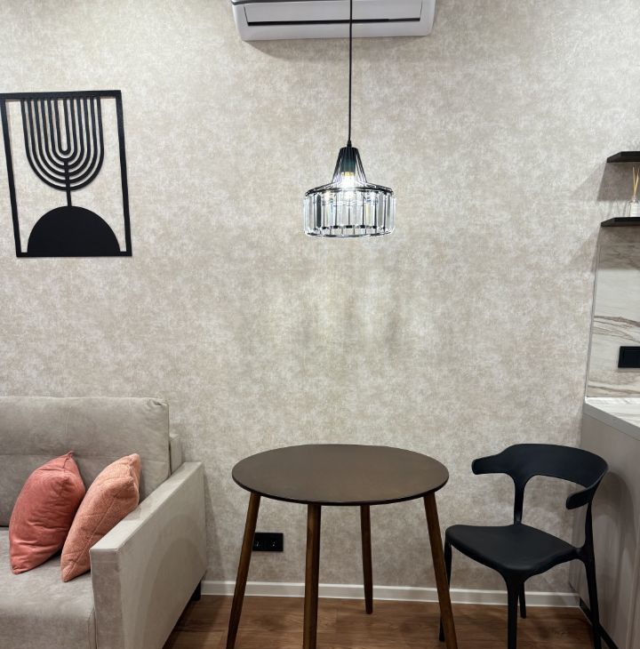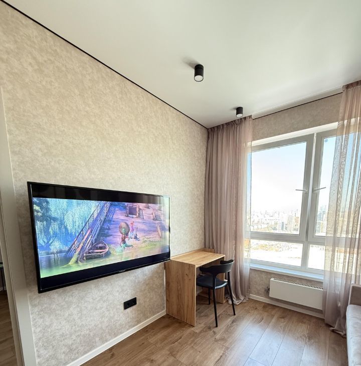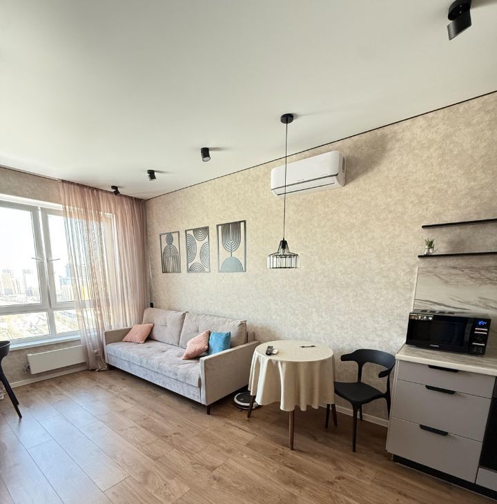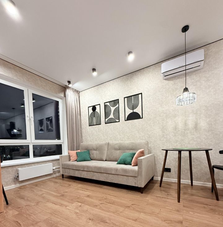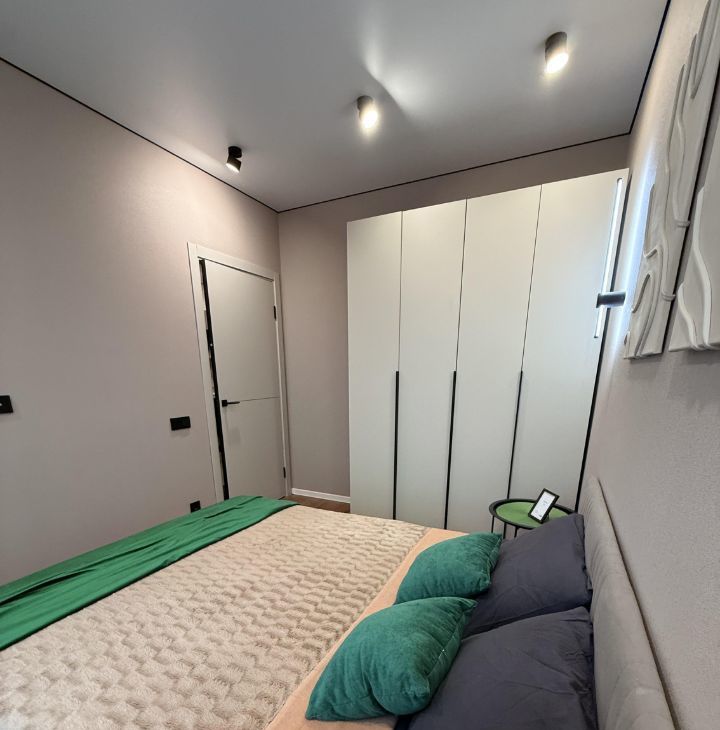 Квартира: дизайнерский ремонт, качественные материалы. Спальная комната с мягким освещением и просторная гостиная , рабочая зона.