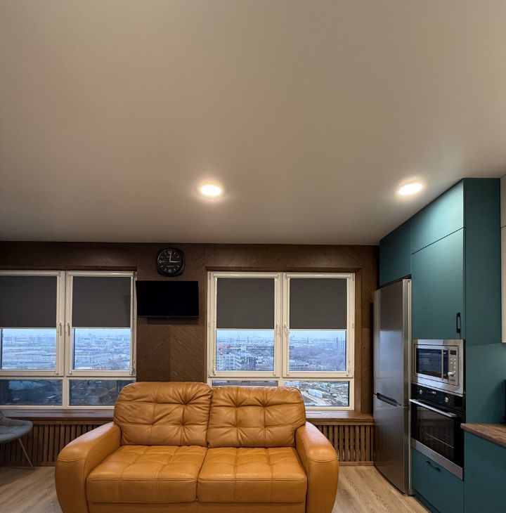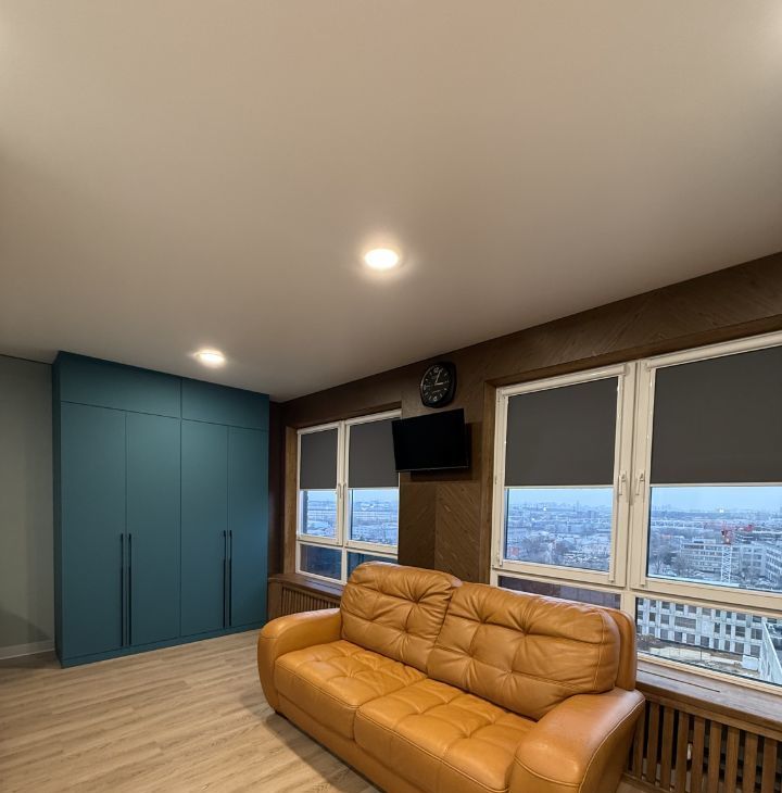 В спальной зоне установлена кровать с ортопедическим матрасом (высота 27см) и местом для хранения. Предусмотрено несколько вариантов комбинированного освещения и подсветок. Высокий, вместительный шкаф и кожаный диван, который быстро и легко трансформируется в дополнительное 2-спальное место.