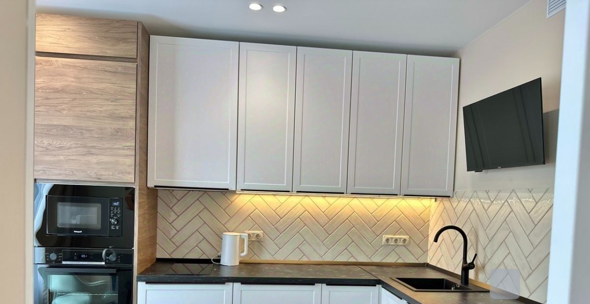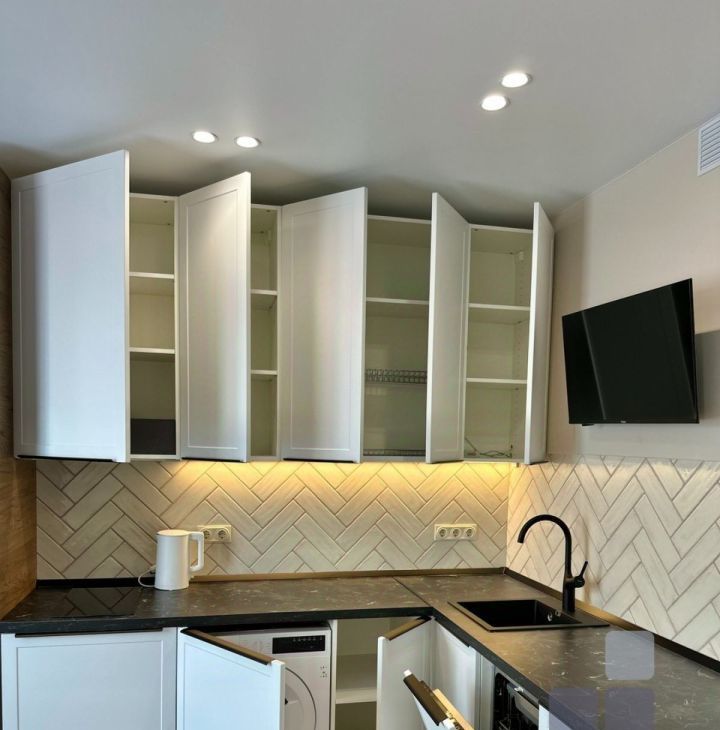 Кухонный гарнитур со встроенной техникой (стиральная машина, холодильник, варочная панель, духовой шкаф, вытяжка, посудомоечная машина, микроволновая печь/гриль) Стильный обеденный стол со стульями. Телевизор.