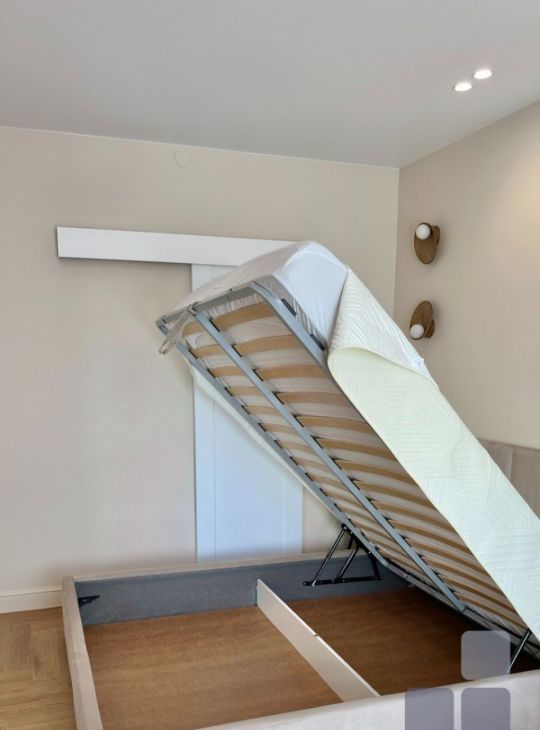 мебель для проживания; двуспальная кровать с ортопедическим матрасом и подъемным механизмом , диван , оборудованная гардеробная комната , телевизор, стенка, столик