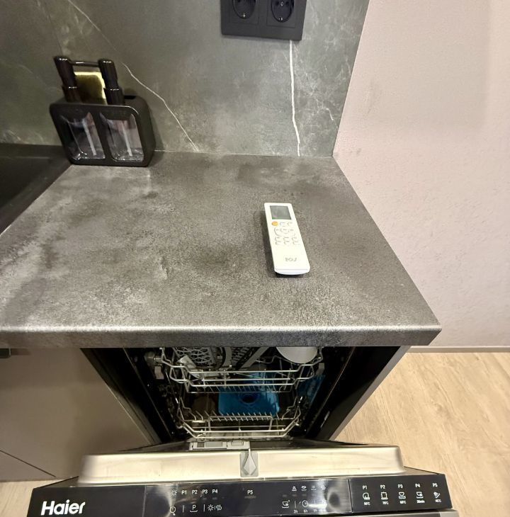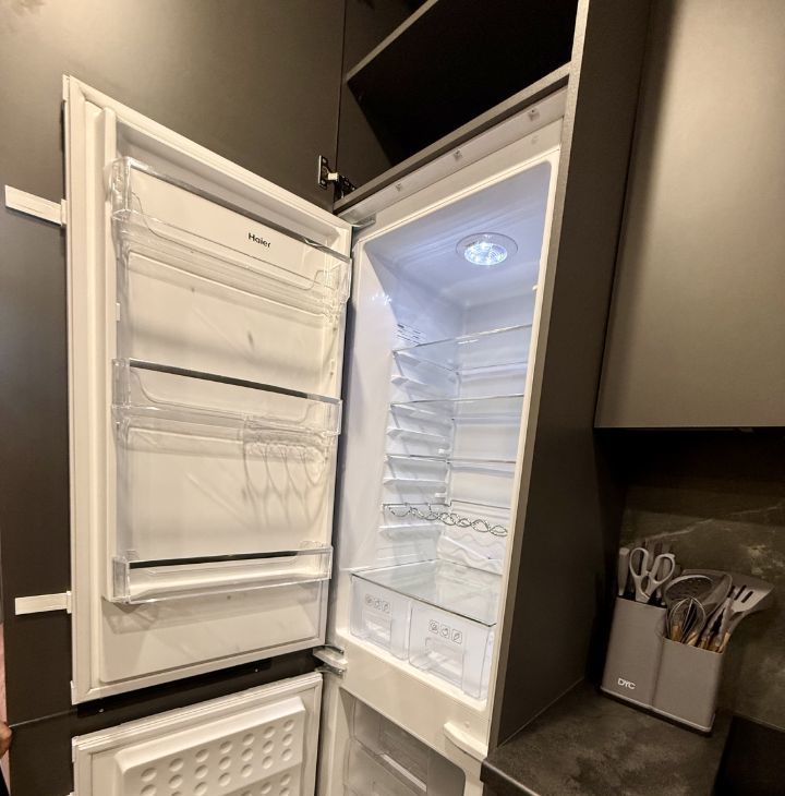 Кухня-гостиная 15,3 кв. м. оборудована современной кухней со встроенной техникой Haier (встроенный холодильник, духовка/свч, посудомоечная машинка, варочная панель, вытяжка). Установлены фильтры для питьевой воды.