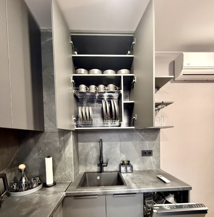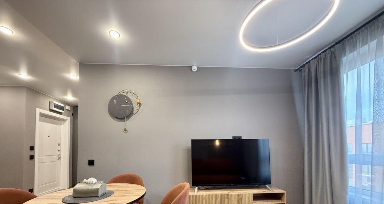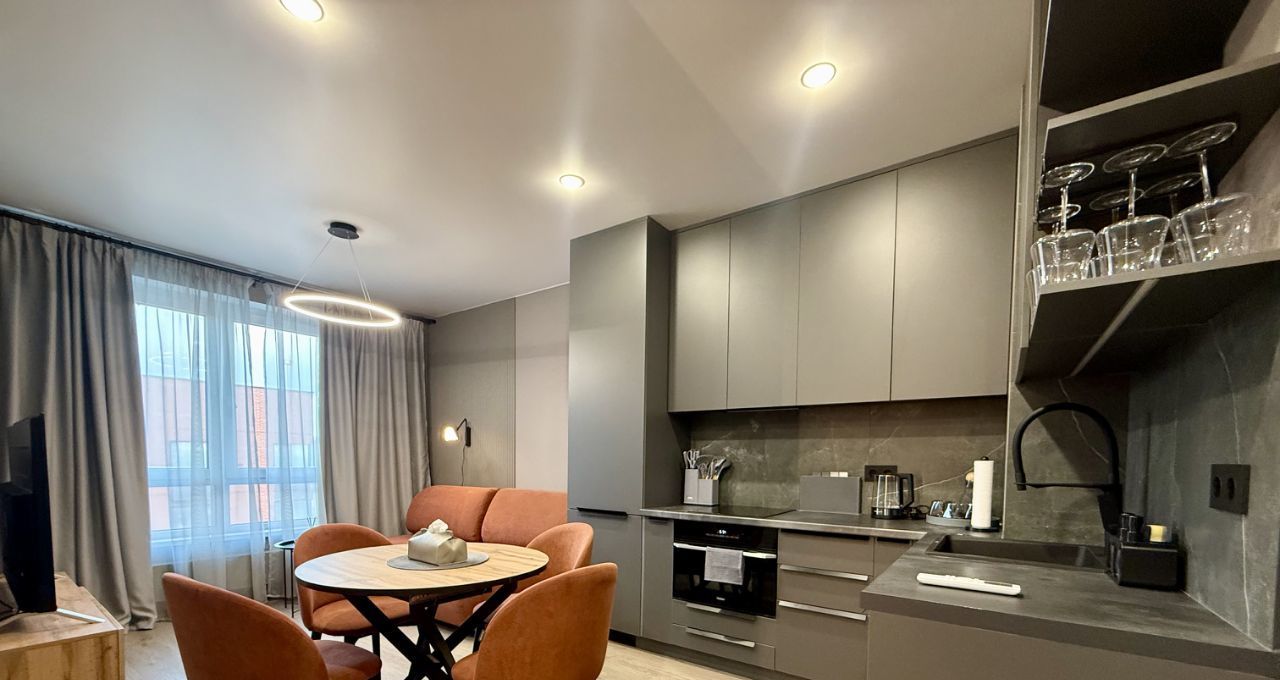 Гостиная зона оборудована диваном, который в разложенном виде превращается в полноценное спальное место. Установлен смарт-TV с возможностью управления Алисой, обеденная зона с удобными креслами. Есть комплект посуды.