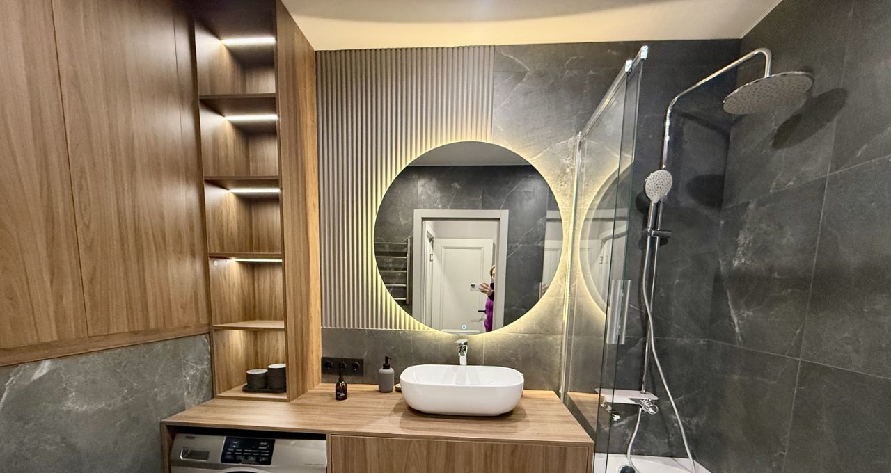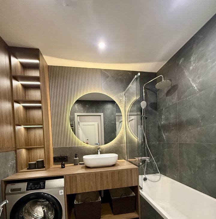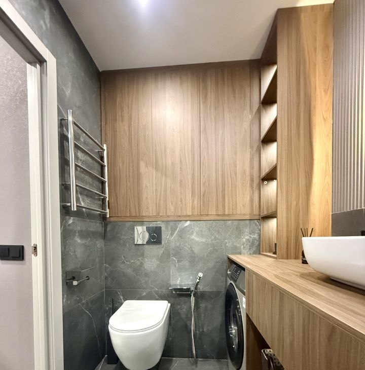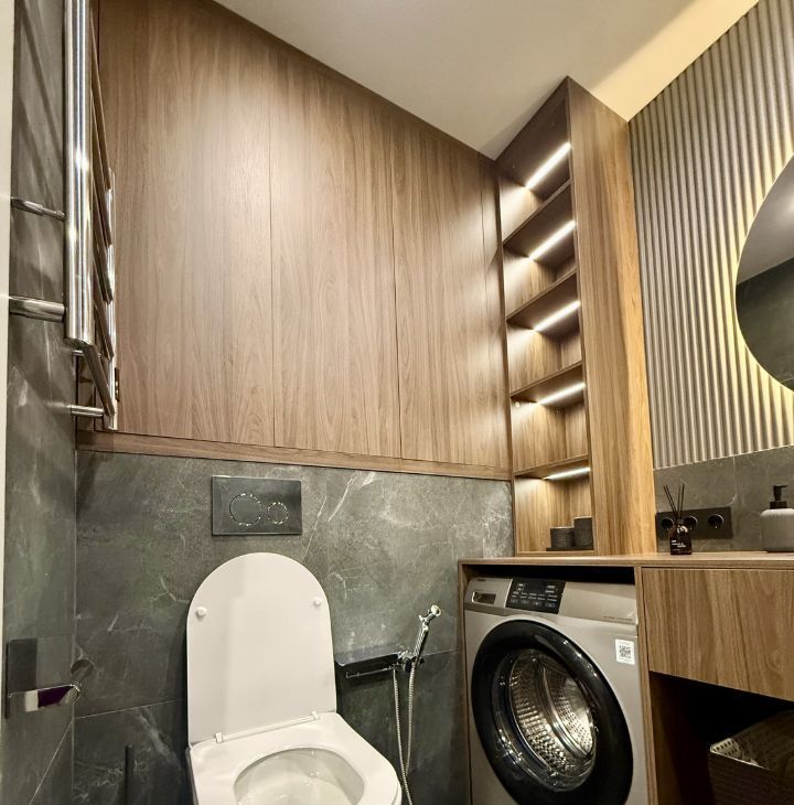 Великолепный санузел, оборудованный подвесным унитазом-инсталляцией, гигиеническим душем, ванной, стиральной машиной, и вместительными шкафчиками.