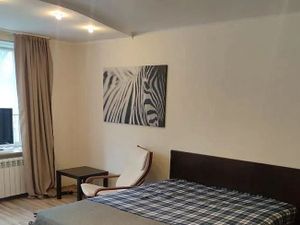 Комната зонирована на гостиную и спальню, отделяется шторой. Гостиная: диван двуспальный раскладной угловой, компьютерный стол, тумба под тв, ТВ Samsung, кондиционер General Climat.