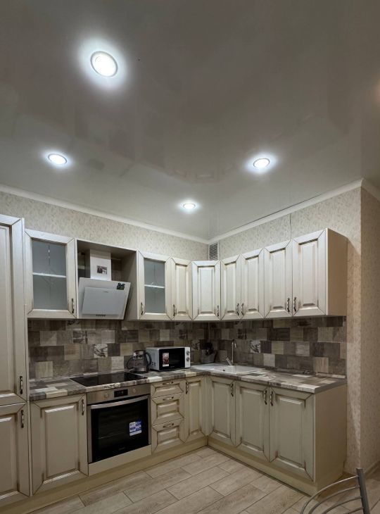 Варочная панель, духовой шкаф, свч, встроенный холодильник, электрический чайник, вытяжка, стиральная машинка, фен, телевизор.