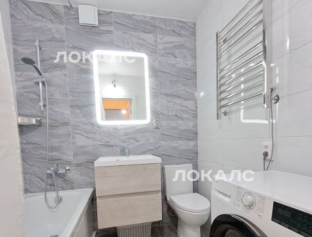 В ванной: стиральная машина, электрический полотенцесушитель, зеркало с подсветкой.