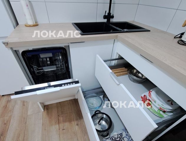 В наличии: кухонный гарнитур со встроенной техникой (включая посудомойку, вытяжку), холодильник, чайник, кофеварка, новая микроволновка. Есть комплект посуды и кастрюли.