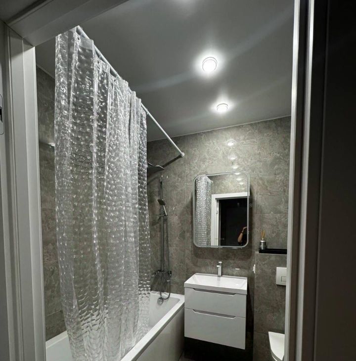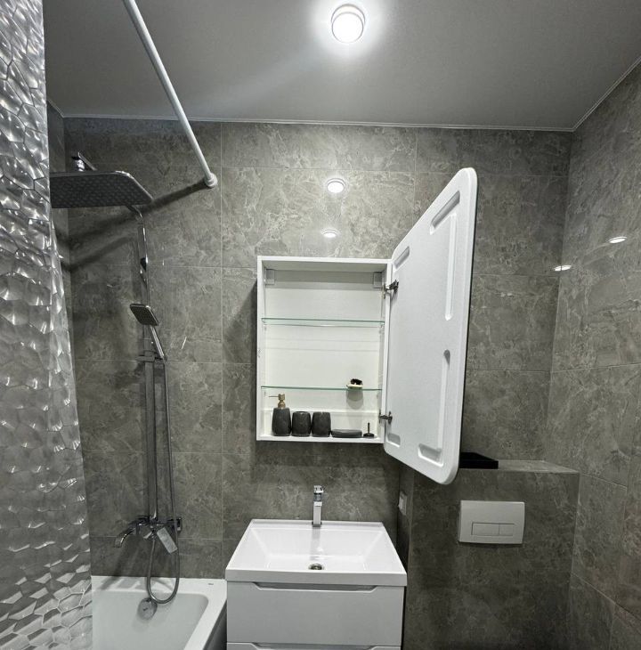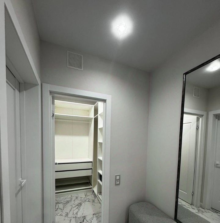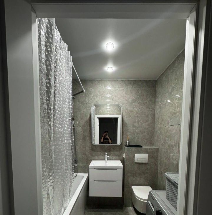 Функциональная гардеробная комната. Санузел совмещенный, красивый широкоформатный керамогранит, подключены стиральная машинка-автомат и проточный нагреватель.