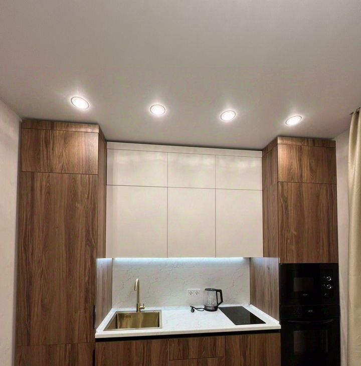 Просторная кухня с современным кухонным гарнитуром.